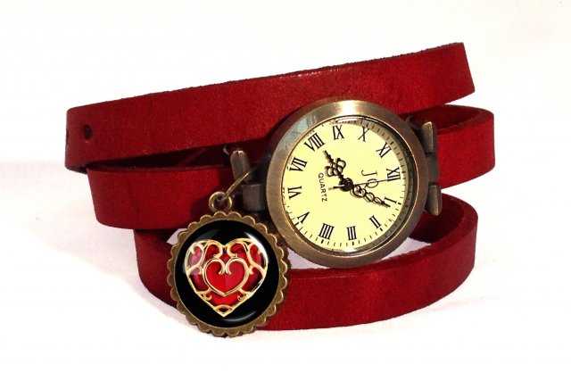 Zegarek ze skórzanym paskiem kilkakrotnie zakręcanym na ręku z ręcznie robioną zawieszką (kaboszonem).