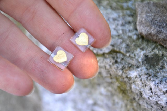 z namalowanym złotym serduszkiem. Kolczyki antyalergiczne, malunek niezmywalny.