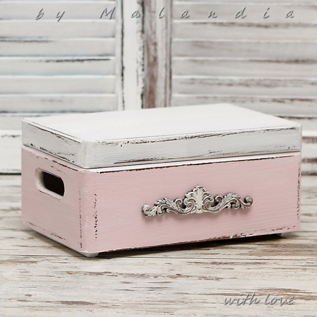 Zamykana drewniana skrzynka pomalowana metodą shabby chic, ozdobiona dekorem Można w niej ukryć wiele drobiazgów, zdjęć.