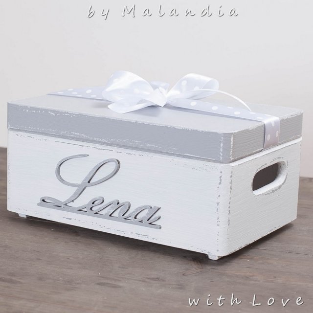 Zamykana drewniana skrzynka , ozdobiona imieniem, to doskonały pomysł na schowanie wielu skarbów naszego dziecka lub tych wszystkich drobiazgów.