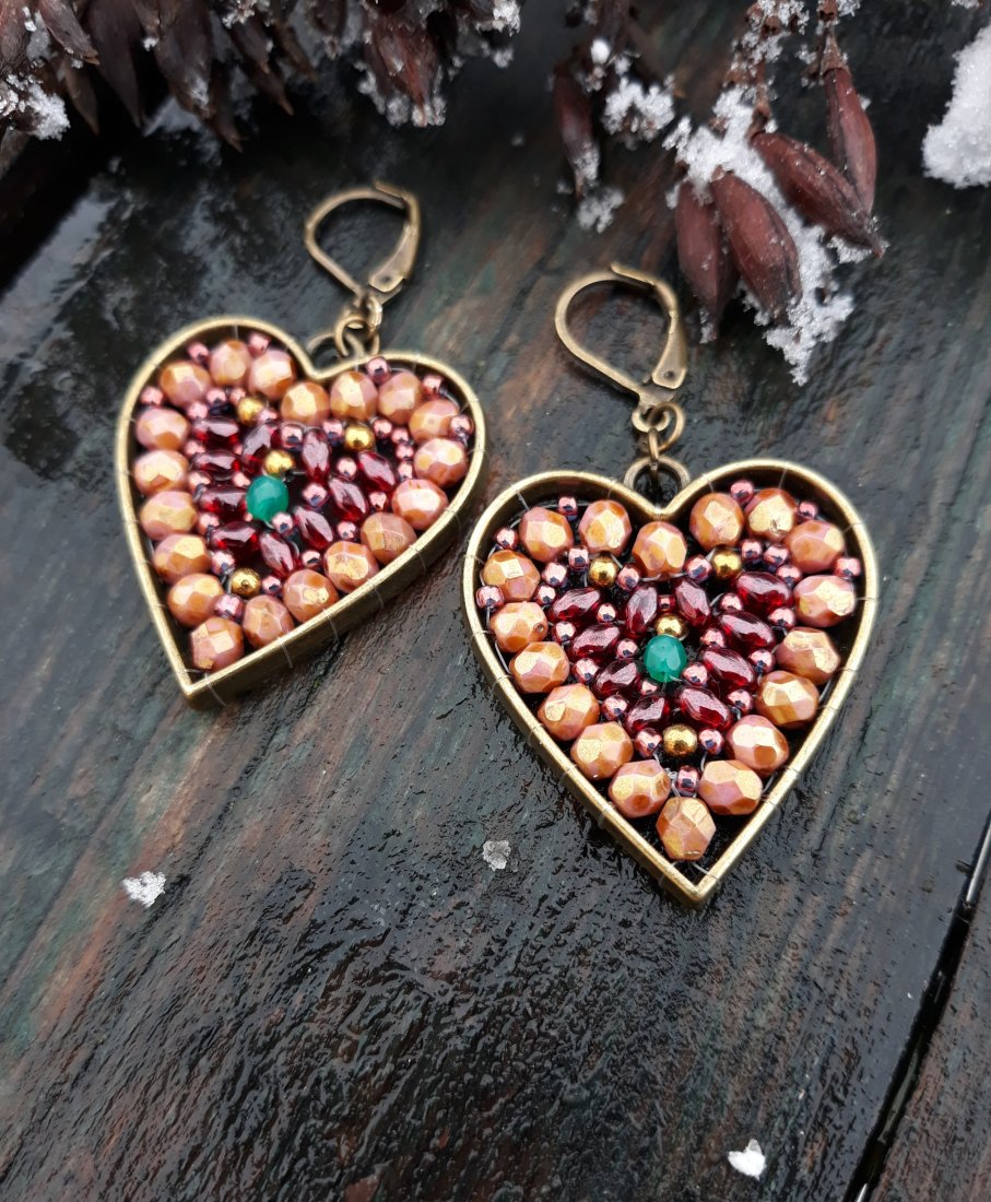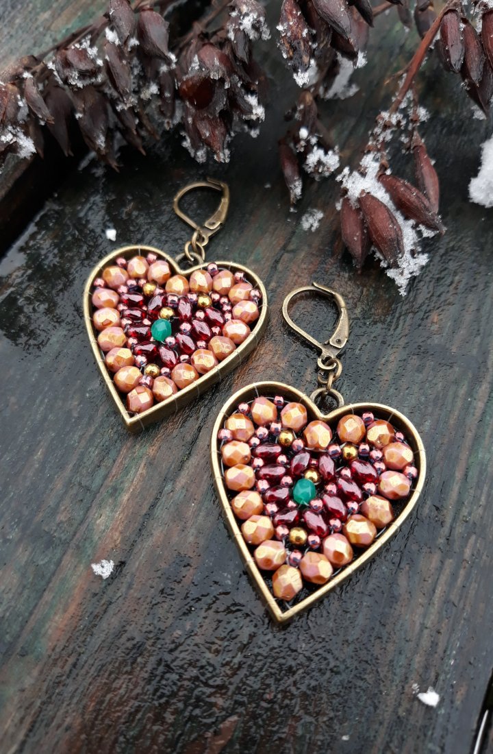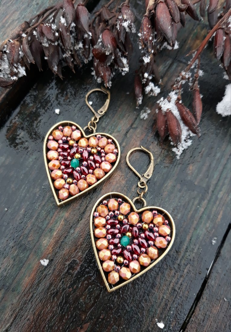 ,,serduszka,, to kolorowe kolczyki wykonane na obręczach ze szklanych koralików i kryształków w różnych odcieniach różu, czerwieni i zieleni. Kolczyki zawieszone są na ozdobnych biglach typu angielskiego w kolorze mosiądzu.