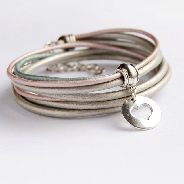POMYSŁ NA PREZENT ;-) delikatna bransoletka wykonana z 4 rzemieni ze 100% skórki naturalnej w odcieniach metalicznych/perłowych (po 2 rzemienie 3mm i 2mm); uroczas zawieszka (serce - wycięte w lekko wypukłym kółeczku) i wykończenie w kolorze srebra. długość regulowana za pomocą łańcuszka. BRANSOLETKA PASUJE NA NADGARSTEK OD 14,5CM. możesz ją nosić samodzielnie lub dowolnie łączyć z innymi bransoletkami z tej serii. świetnie prezentuje się też w zestawieniu z bransoletkami z kamieni naturalnych. UWAGA! CENA DOTYCZY 1 BRANSOLETKI (1 serce) w kolorystyce ze zdjęcia 1. ... spójrz jak podobna bransoletka prezentuje się na nadgarstku ... ZOBACZ CAŁĄ KOLEKCJĘ!!! ... MOJA BIŻU ZAWSZE PODRÓŻUJE OZDOBNIE ZAPAKOWANA - opakowanie hand made ;-) .