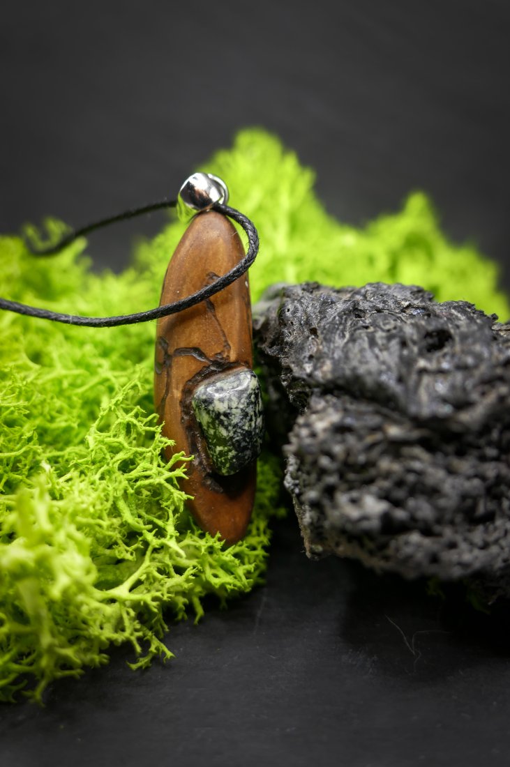 Minimalistyczny wisiorek z brzozy, wykończony w pełni ręcznie. Drewno zostało wyszlifowane, woskowane i polerowane, a następnie bejcowane na odcień kasztanu, dzięki czemu zyskało ciepłą i elegancką barwę.