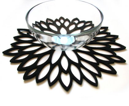 Przepiękna ażurowa serwetka wycięta laserowo w czarnym filcu grubości 4mm. W kształcie kwiatka, okrągła, oryginalna, stanowi uroczy i praktyczny dodatek dla wnętrza. serwetka idealnie nadaje się również jako podkładka pod duże gorące naczynie, chroniąc stół przed zniszczeniem. Idealna na prezent, może stanowić komplet z dostępnymi w galerii innymi produktami z tej serii. Polecam:)