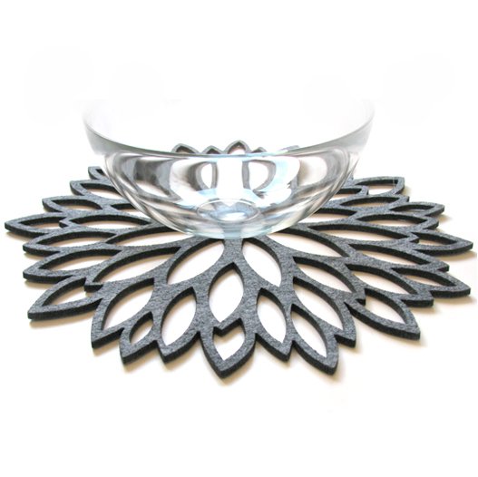 Przepiękna ażurowa serwetka wycięta laserowo w szarym filcu grubości 4mm. W kształcie kwiatka, okrągła, oryginalna, stanowi uroczy i praktyczny dodatek dla wnętrza. serwetka idealnie nadaje się również jako podkładka pod duże gorące naczynie, chroniąc stół przed zniszczeniem. Idealna na prezent, może stanowić komplet z dostępnymi w galerii innymi produktami z tej serii. Polecam:)