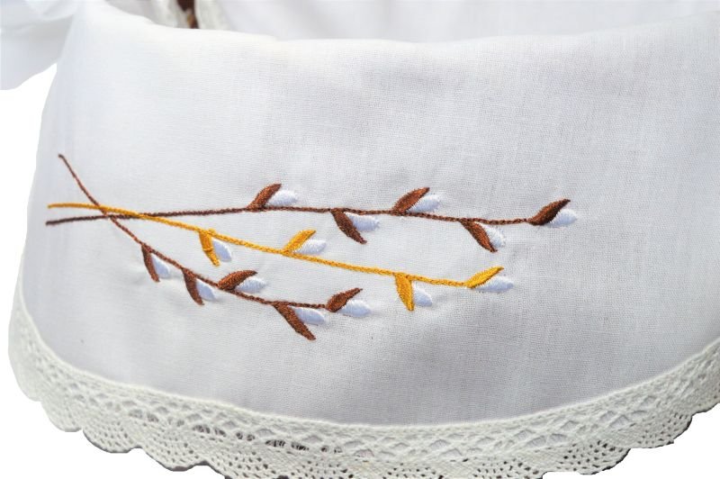 Przedstawiamy WIĄZANĄ, uniwersalną serwetkę do koszyczka Wielkanocnego zdobioną bawełnianą koronką, wykonaną w naszej pracowni. Urocze hafty dodadzą koszyczkowi niepowtarzalnego charakteru. Wiązania wykonane z białej tasiemki.