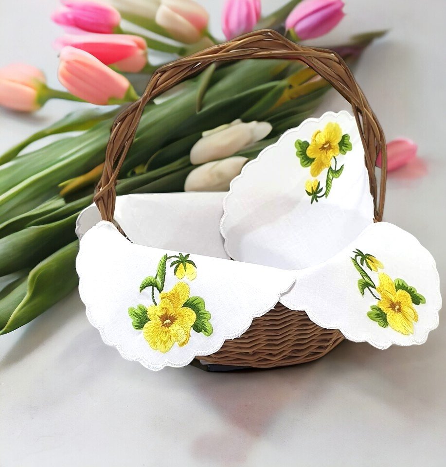 Ludowa serwetka do koszyczka wielkanocnego zdobiona pięknym tradycyjnym haftem wykonana przez twórczynię ludową. Serwetka w kształcie koniczyny, przez co pięknie się układa w koszyczku. Haft ręczno maszynowy