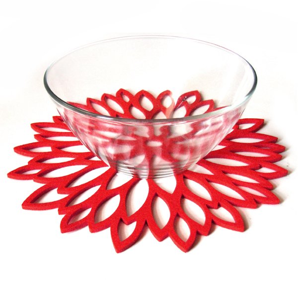 Przepiękna ażurowa serwetka wycięta laserowo w filcu grubości 4mm, w kolorze czerwonym. W kształcie kwiatka, okrągła, oryginalna, stanowi uroczy i praktyczny dodatek dla wnętrza. Serwetka idealnie nadaje się również jako podkładka pod duże gorące naczynie, chroniąca stół przed zniszczeniem. Idealna na prezent, może stanowić komplet z dostępnymi w galerii innymi produktami z tej serii. Polecam:)