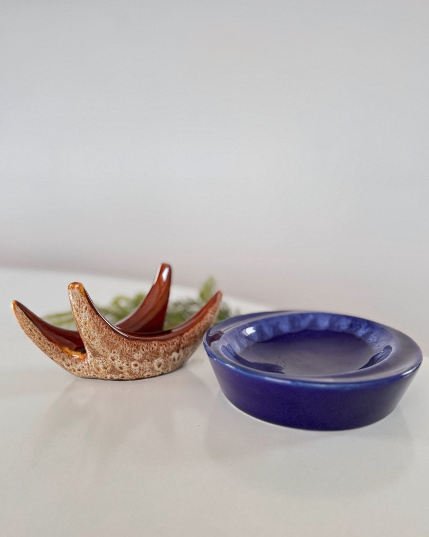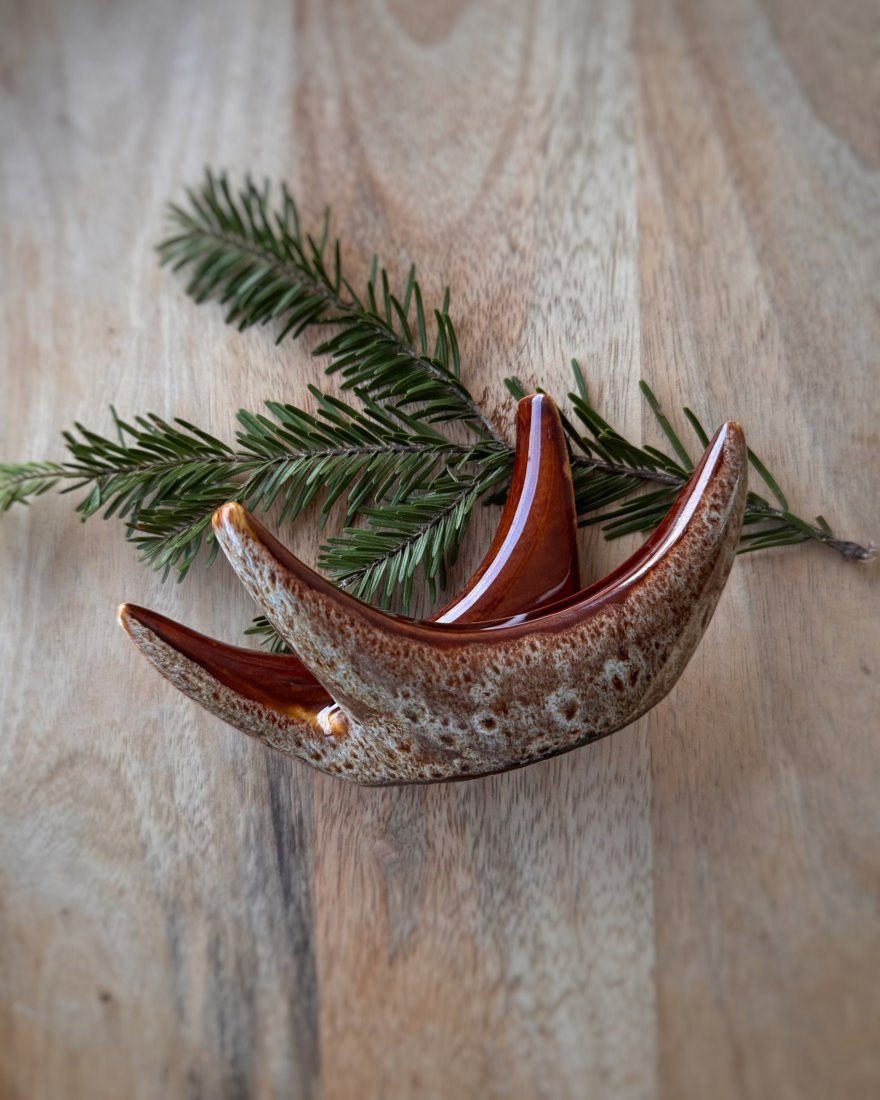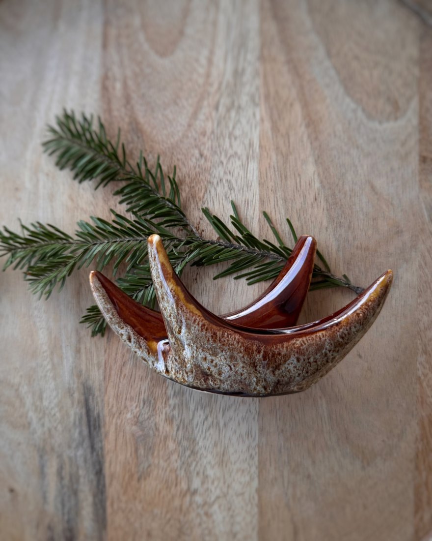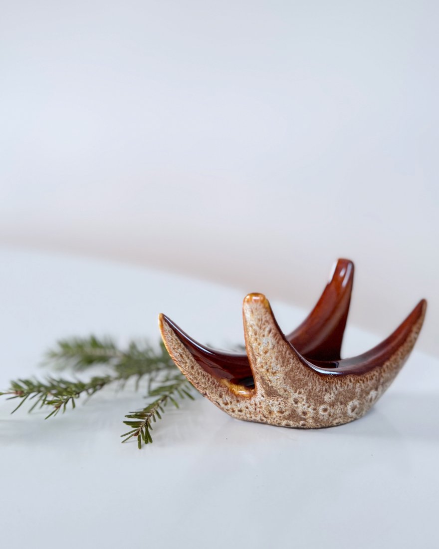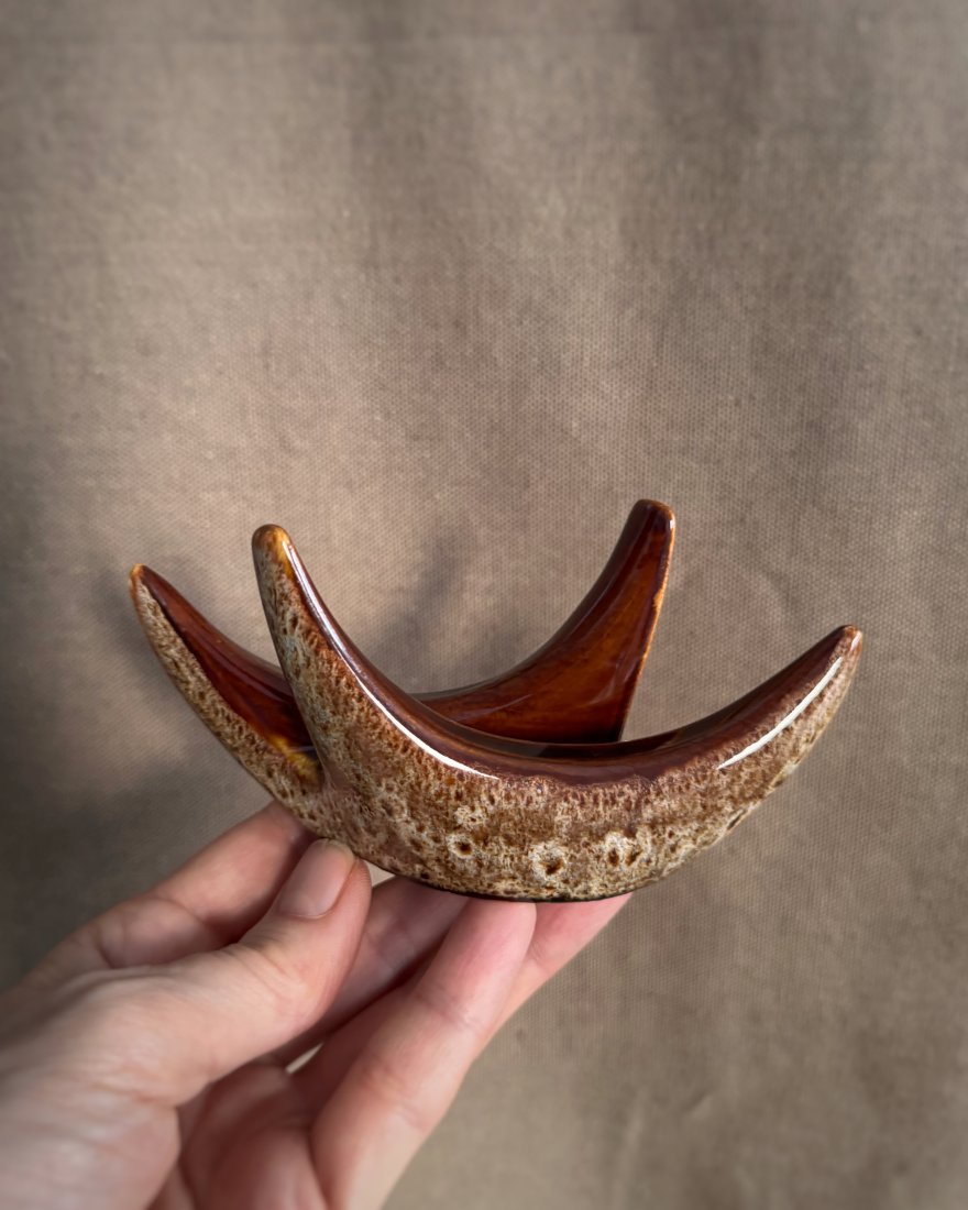 Serwetnik rogi produkowany wg projektu Adama Sadurskiego w charakterystycznym szkliwieniu w brązach. Lata 70 XX w.