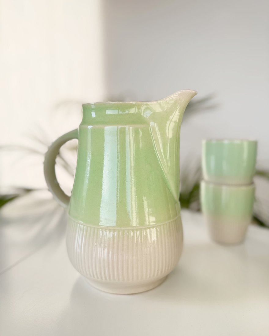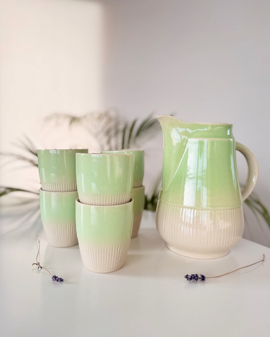Serwis do napojów Maria składający się z dzbanka i 6 kubków produkowany od około 1980 roku w Mirostowickich Zakładach Ceramicznych.