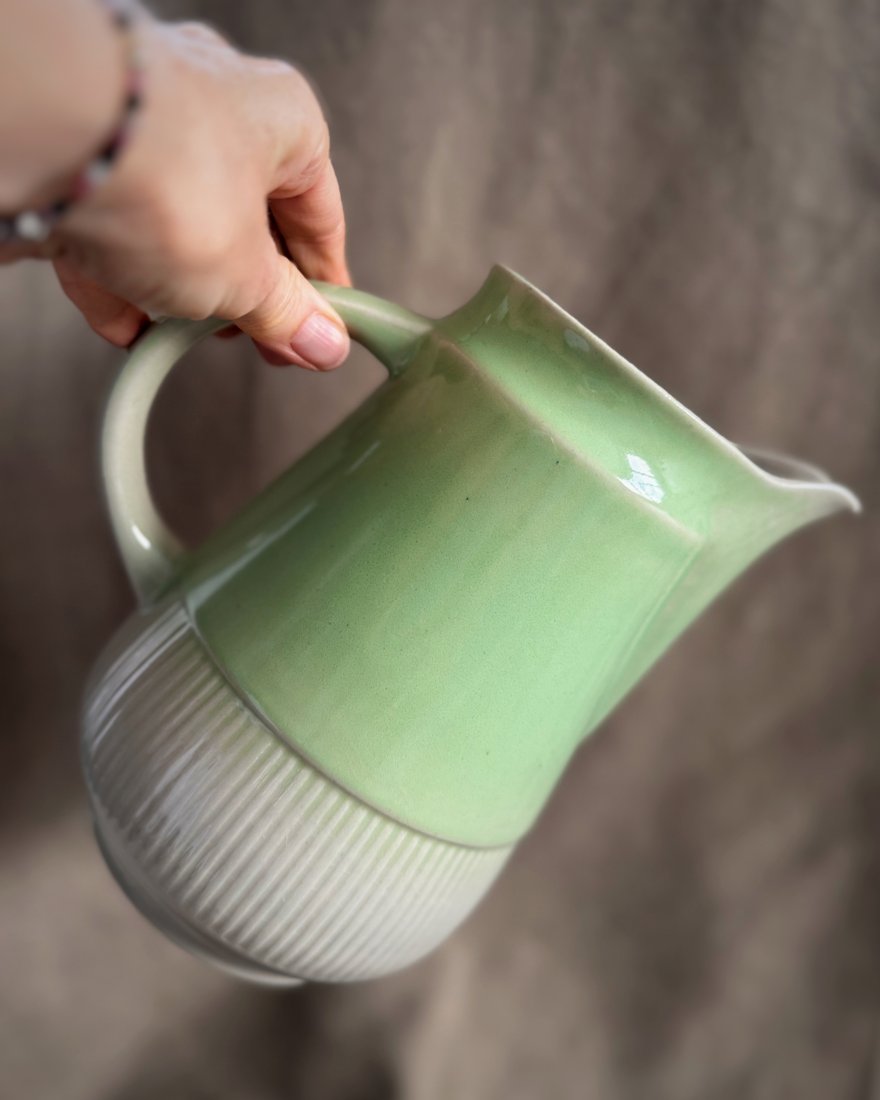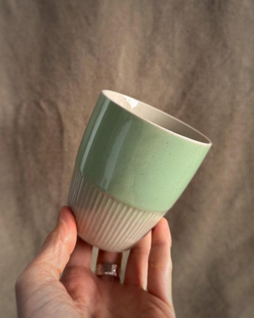 Wykonany z porcelitu, szkliwiony na piękny i rzadki kolor zielony w odcieniu groszku.