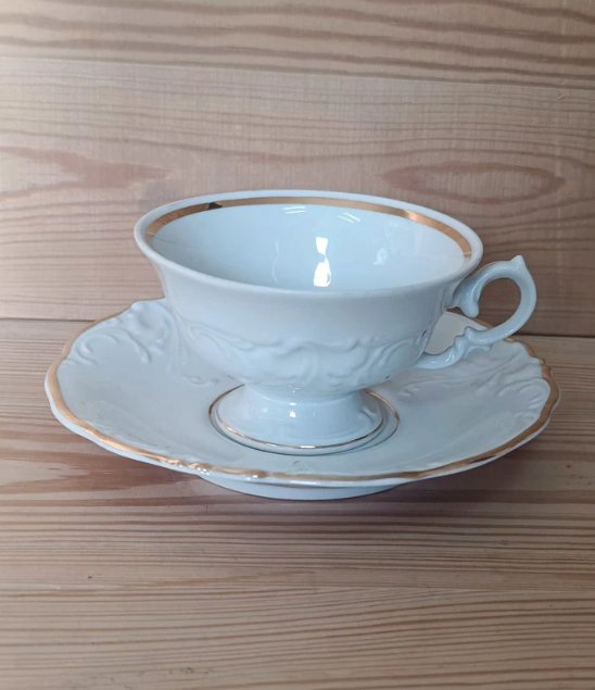 - 5 filiżanek z podstawkami - pojemność 150 ml (jedna podstawką ma obtłuczenia od spodu, niewidoczne z góry; szósta filiżankę dorzucam gratis, bo nie ma podstawki)