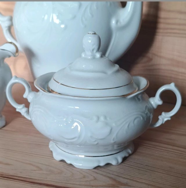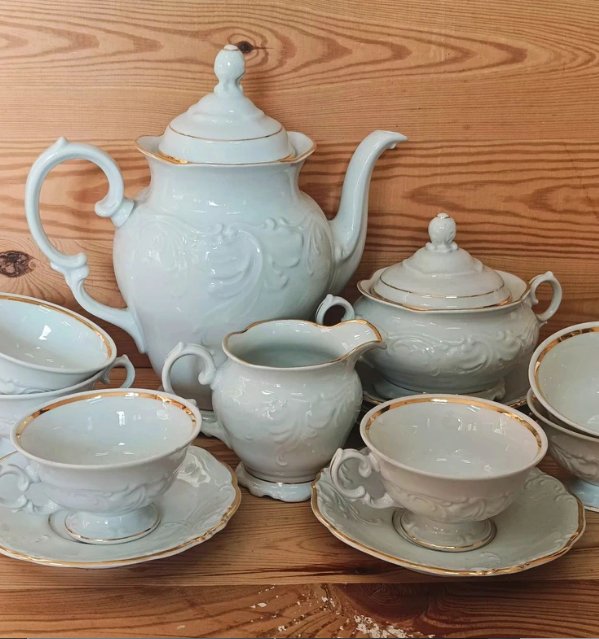 Piękny, porcelanowy serwis kawowy wyprodukowany w Wałbrzychu, wersja eksportowa. Kolor biały ze złoceniami. W skład wchodzą: