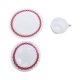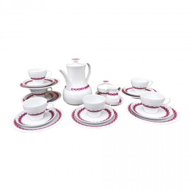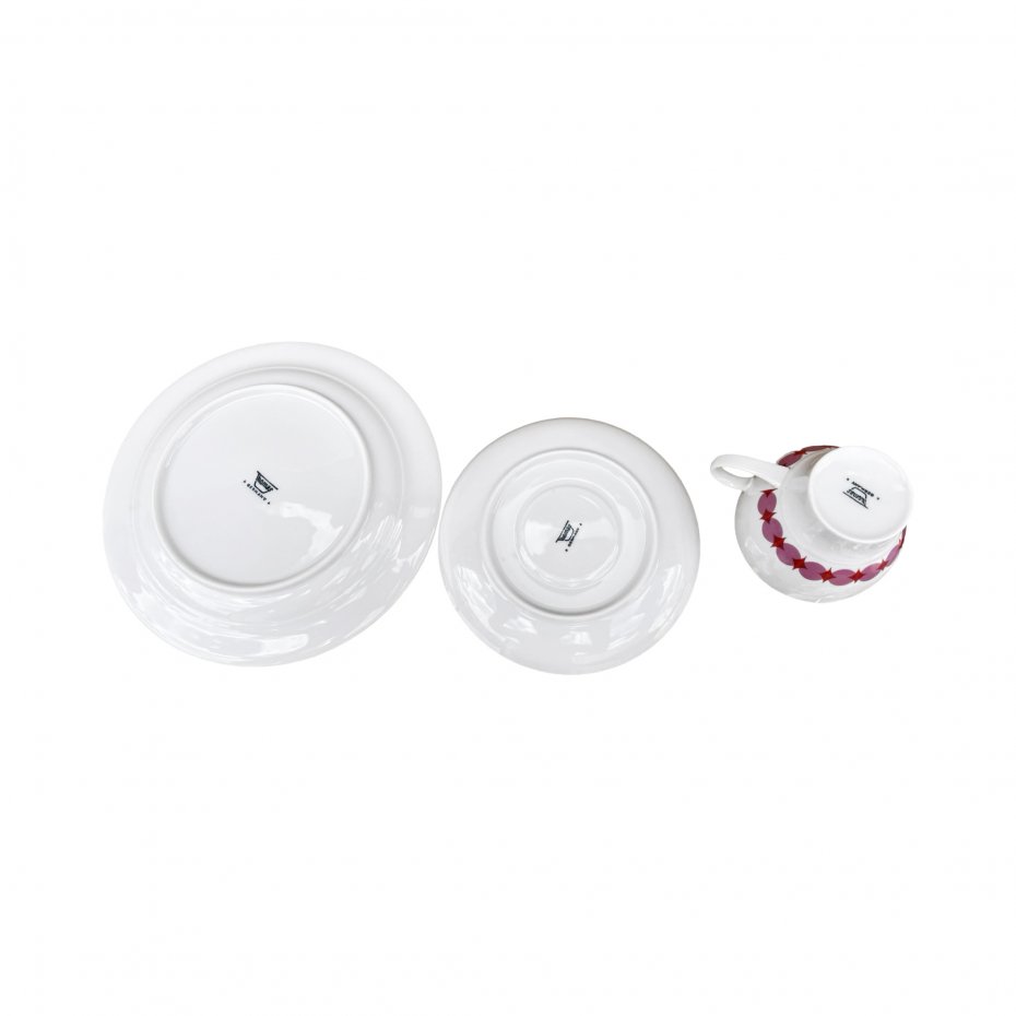 Pochodzi z Niemiec z Marktredwitz z Porzellanfabrik F. Thomas Marktredwitz / Rosenthal & Co. AG. Lata 60-te XX wieku. Wykonany według projektu Tapio Wirkkali, fason Rotunda. Porcelana biała, z pięknym różowym dekorem. O ciekawej, estetycznej linii. Rozwarta czasza filiżanki i prosta forma talerzyków. Każdy element ozdobiony szerokim pasem różowej malatury z wzorkiem w stylu Op-Art.