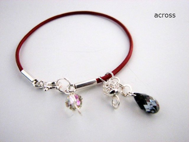Delikatna bransoletka w całości ze srebra oraz 2mm skórzanego rzemyka w kolorze intensywnej czerwieni. Uzupełniona 10mm kropelką i 5 mm fasetkowaną kuleczką swarovskiego. Długość: 18 cm. Pasuje na nadgarstek o obwodzie 15 cm - 16.5 cm. Na życzenie dopasuję bransoletkę do indywidualnych potrzeb.
