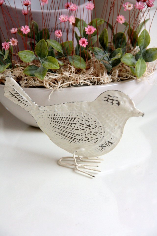 Ciekawy metalowy ptaszek. W kolorze białym z celowymi przetarciami. W pozycji stojącej:)