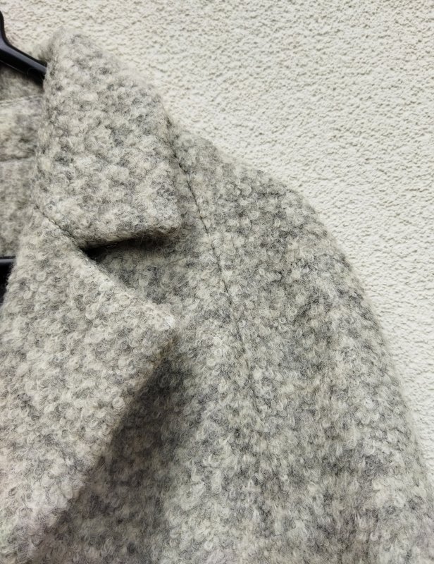 Ciepły płaszcz z dobrej jakości tkaniny z fakturą boucle w melanżowej kolorystyce szarości ze złamana bielą. Z kołnierzem z rewersami z dwiema wpuszczanymi kieszeniami , z krytym rozcięciem z tylu u dołu. zapinany na guziki. Całość na podszewce.