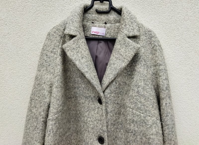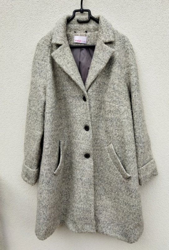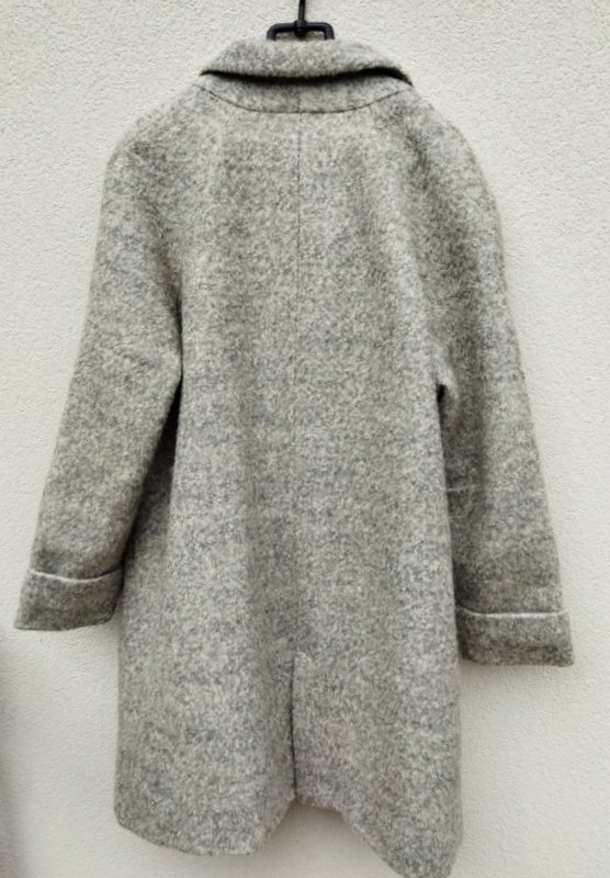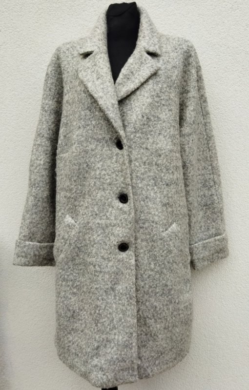 Ciepły płaszcz z dobrej jakości tkaniny z fakturą boucle w melanżowej kolorystyce szarości ze złamana bielą. Z kołnierzem z rewersami z dwiema wpuszczanymi kieszeniami , z krytym rozcięciem z tylu u dołu. zapinany na guziki. Całość na podszewce.