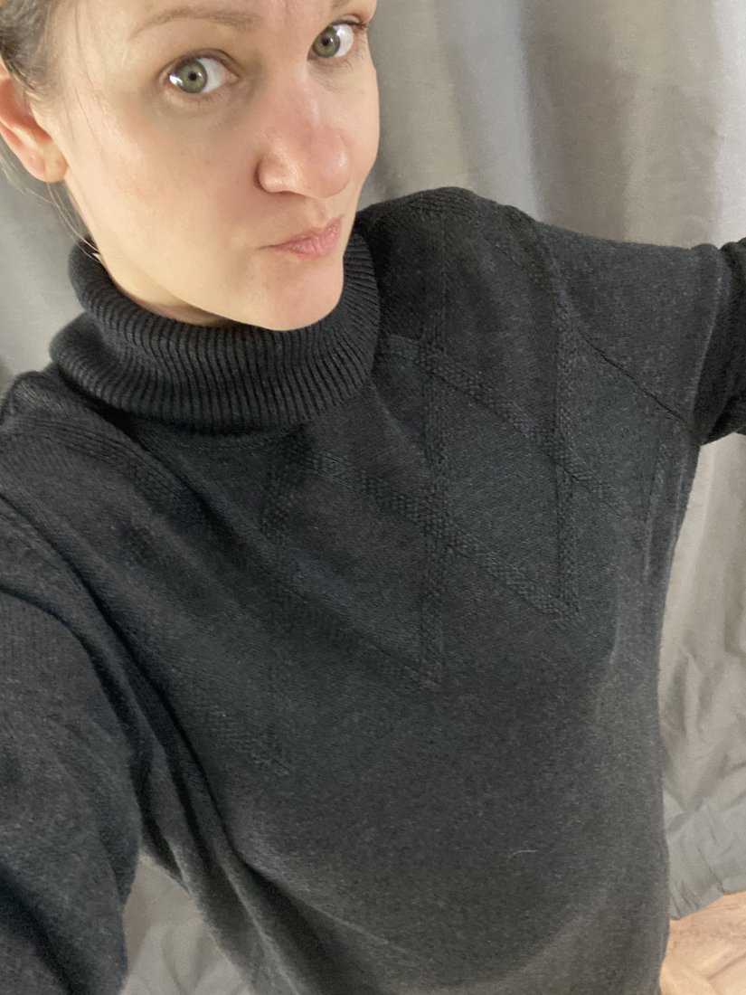 Dzianinowa sukienka od Sheego. Oversizowa, ze zdobieniem pod golfikiem. Miękka, z wiskozy 33%, nylonu 23%, bawełny 20%, wełny 20%, kaszmiru 4%.