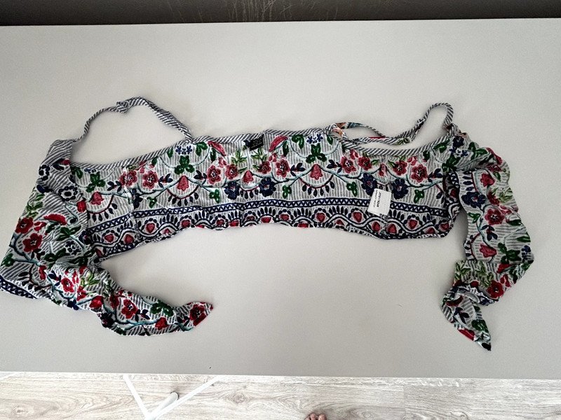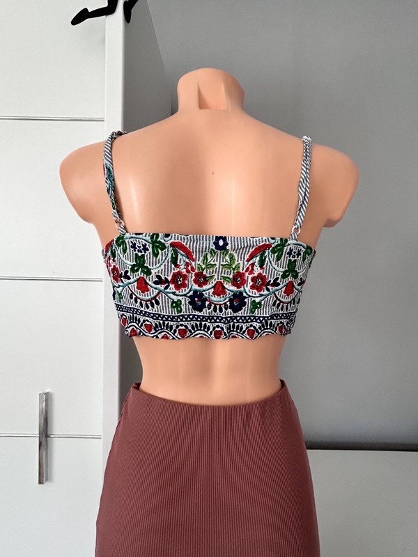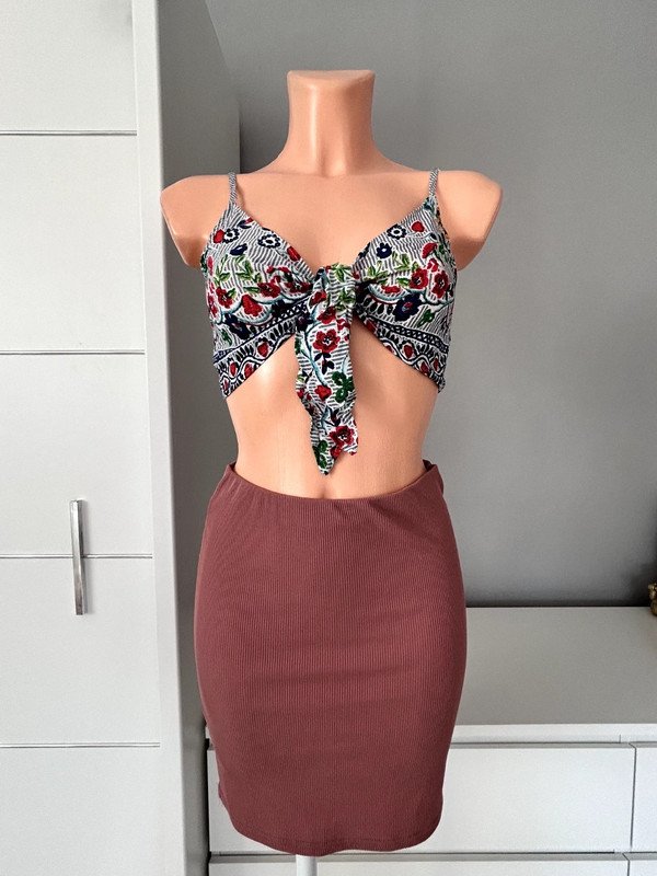 Crop top marki Shein, rozmiar z metki to 36 S. Wykonany w 100% z rayonu. Posiada wzorki, można go wiązać tak, żeby idealnie pasował do sylwetki.