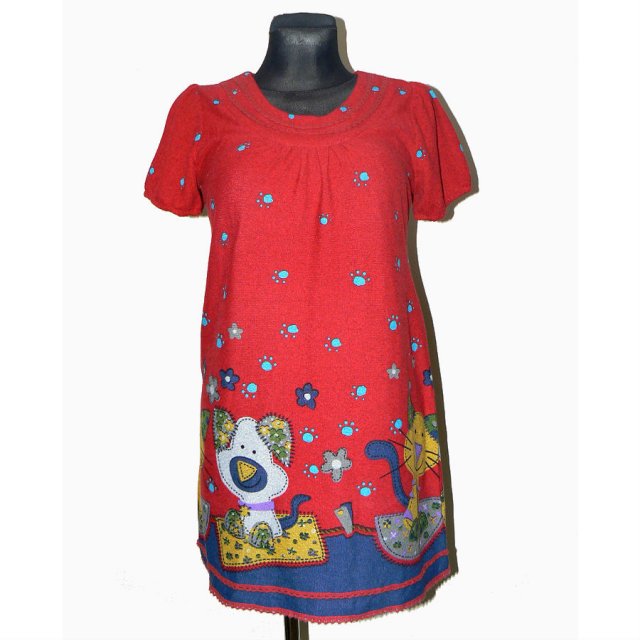 Zabawny kolorowy wzór. Dół tuniki i dekolt obszyte bawełnianą cienką koronką.