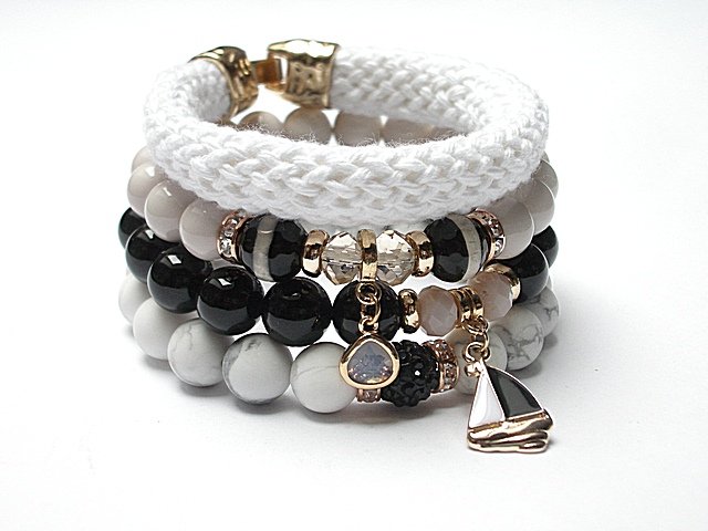 Komplet czterech bransoletek wykonanych z naturalnych kamieni: fasetowane agaty [10mm], onyks [10mm], matowe howlity [10mm], szklane perły [10mm], kryształki fasetowane [8mm], kuleczka shamballa [10mm], bawełniana lina [szer. 12mm], zawieszki w okuciu oraz elementów metalowych w kolorze tzw. różowego złota. Bransoletki z kamieni i szkła na gumce silikonowej. Pasują na nadgarstek 16-17cm. W przypadku zmiany rozmiaru bransoletek prosimy o wcześniejszy kontakt. Biżuteria ozdobnie zapakowana.