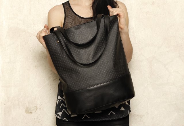 Oryginalna torebka wykonana z gładkiej i perforowanej eko-skóry w kolorze czarnym. W środku bawełniana wzorzysta podszewka, dwie kieszonki w tym jedna zapinana na zamek. Całość zapinana na zatrzask. Torebka mieści format A4. Wymiary: Wysokość: 40cm Szerokość : 40cm. Termin realizacji zamówienia to 5-6 dni.
