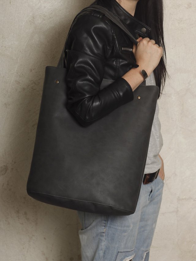 Oryginalna torebka wykonana z lekko przecieranej ekoskóry w kolorze grafitowym. W środku bawełniana wzorzysta podszewka, dwie kieszonki w tym jedna zapinana na zamek. Całość zapinana na zatrzask. Torebka mieści format A4. Wymiary: Wysokość: 40cm Szerokość : 40cm. Termin realizacji zamówienia to 5-6 dni.