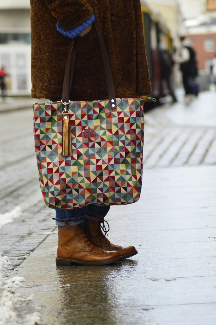 Torba powstała z tkaniny gobelinowej oraz skóry naturalnej ( rączki oraz chwost). Wewnątrz znajdują się trzy kieszonki, a całość zapina się na suwak. Torba została dodatkowo wzmocniona warstwą wodoodporną.