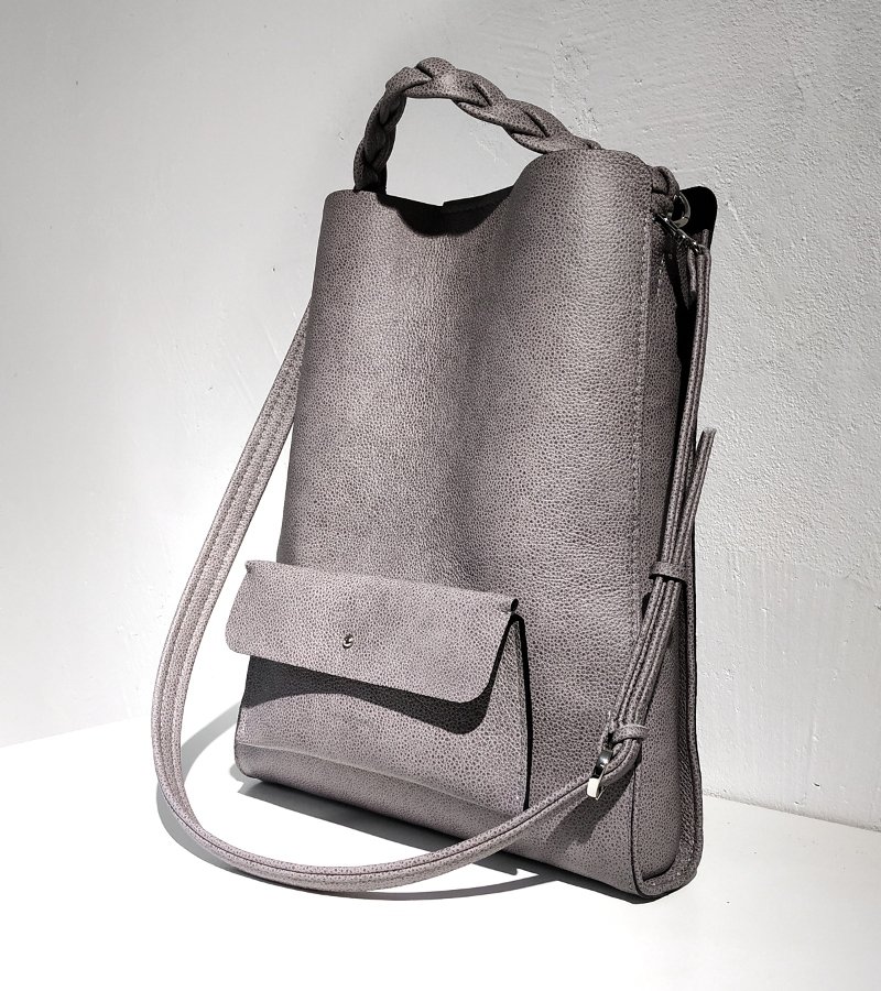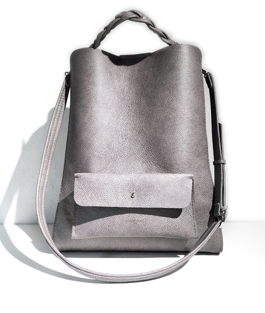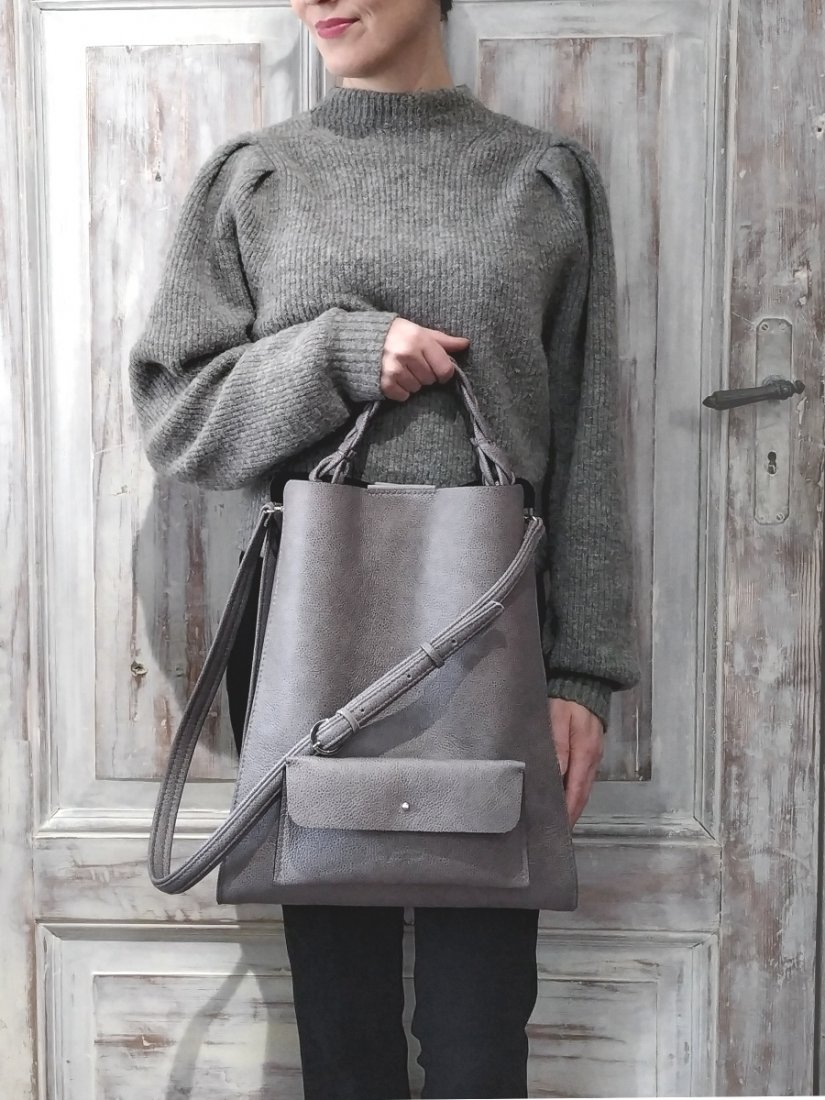 -wierzch torby wykonany w groszkowej, licowej skórze w odcieniu szarości