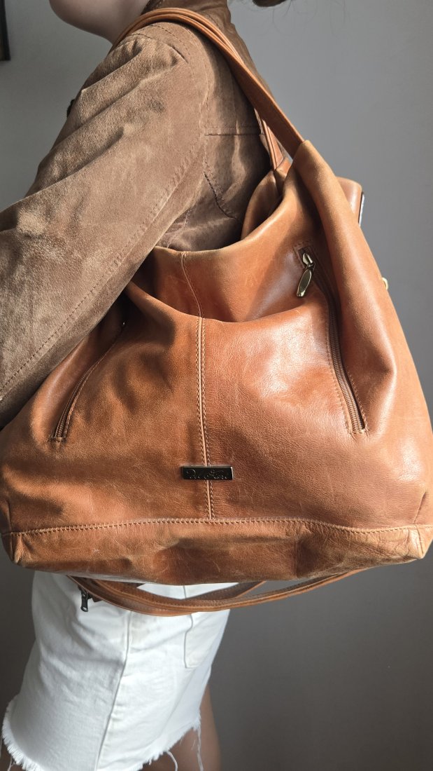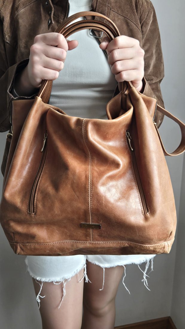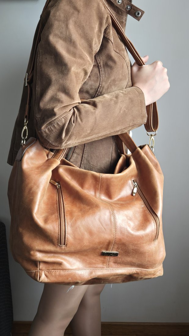 Duża torebka damska o casualowym, uniwersalnym charakterze. Uszyta z miękkiej skóry bydlęcej, pasek z bydlęcej skóry licowej. Z przodu, w zamkach, ukryte 2 kieszenie pionowe. Jednokomorowa, zamykana na suwak. Wewnątrz na ściance 1 kieszeń zamykana na suwak, 1 na telefon/smartfon , w drugiej 2 kieszenie otwarte.