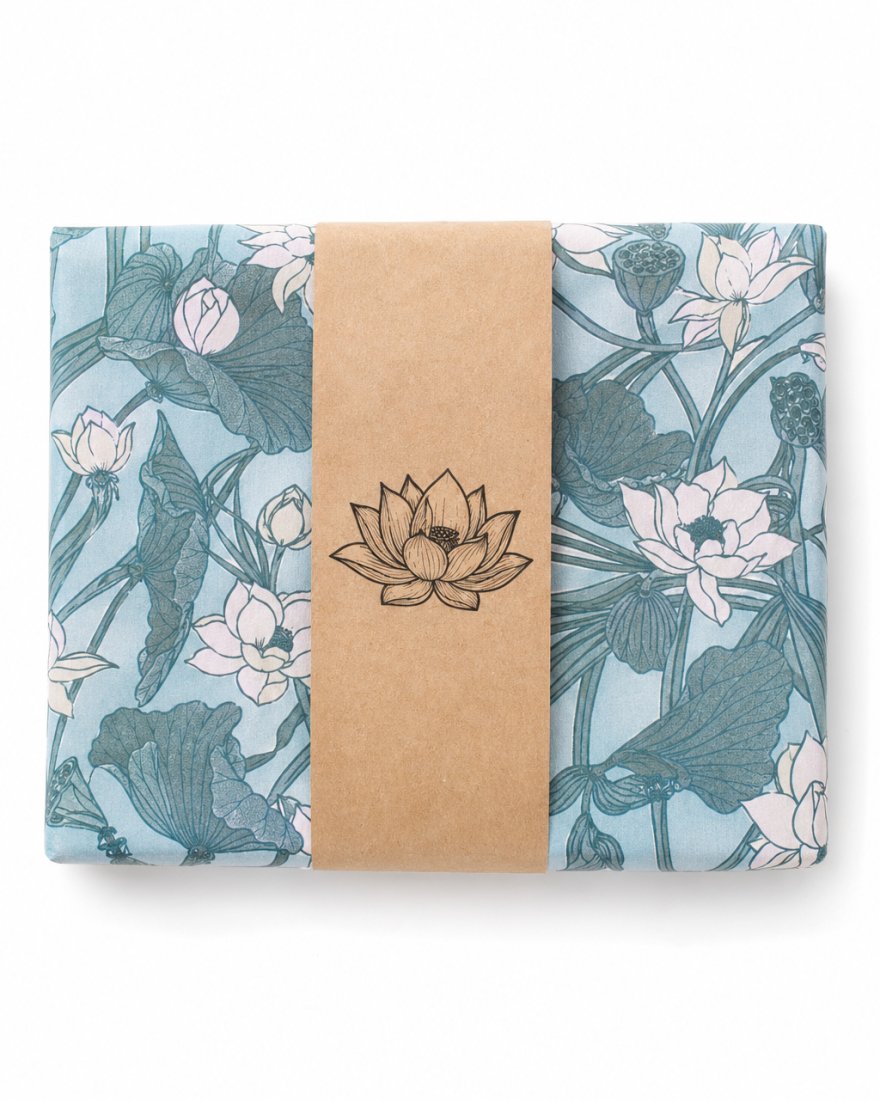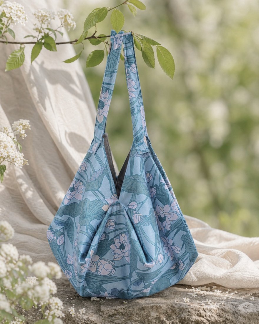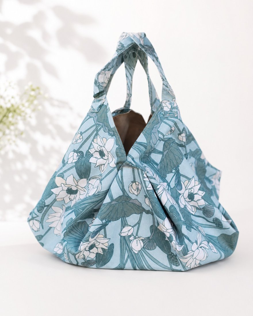 Forma torby nawiązuje do kwiatu lotosu oraz sztuki origami i dopasowuje się ładnie do zawartości. Ma delikatny szałwiowy kolor z wyraźniejszymi akcentami zielonych liści i beżowych kwiatów.