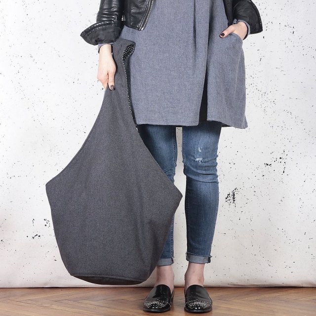 Wykonana z tkaniny syntetycznej imitującej wełnę w kolorze grafitowym (melanż)- materiały starannie dobrane, bardzo dobrej jakości. W środku dwie kieszonki zapinane na zamek. Torebka wykończona bawełnianą podszewką (w kropki, paski; dopasowaną kolorystycznie do całości). Torebka zapinana na zamek.