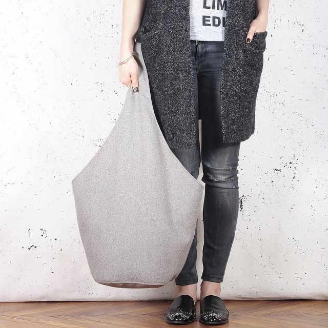 Wykonana z tkaniny syntetycznej imitującej wełnę w kolorze jasnoszarym (melanż)- materiały starannie dobrane, bardzo dobrej jakości. W środku dwie kieszonki zapinane na zamek. Torebka wykończona bawełnianą podszewką (w kropki, paski; dopasowaną kolorystycznie do całości). Torebka zapinana na zamek.