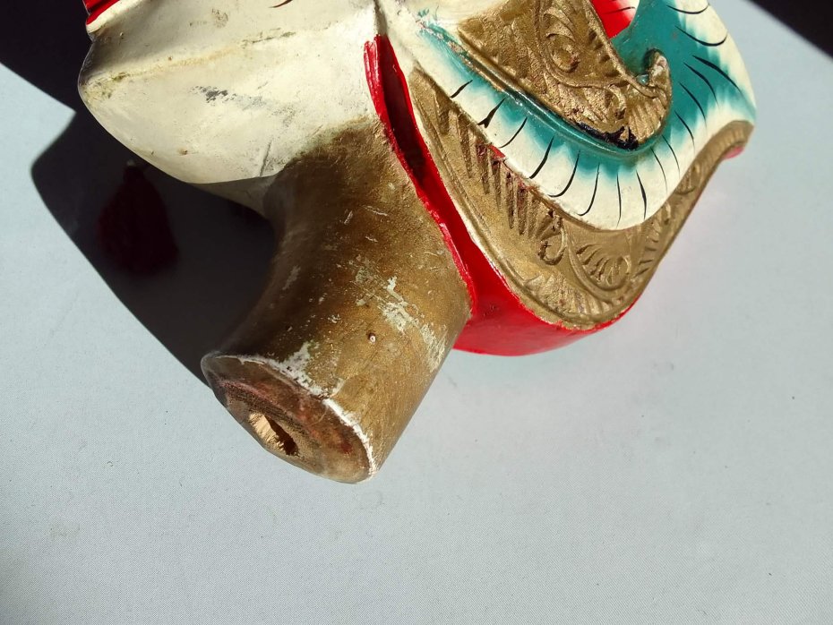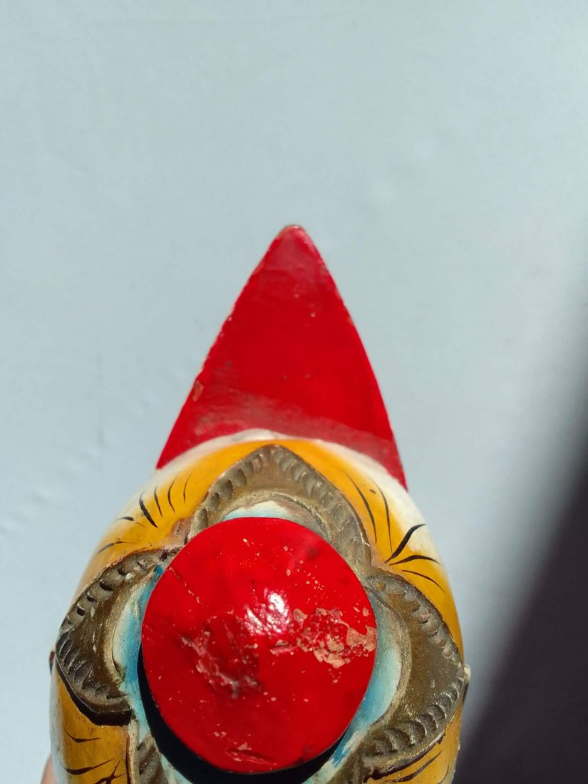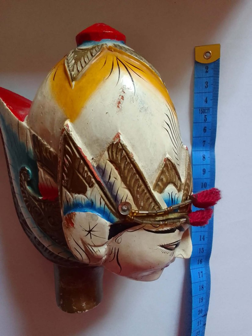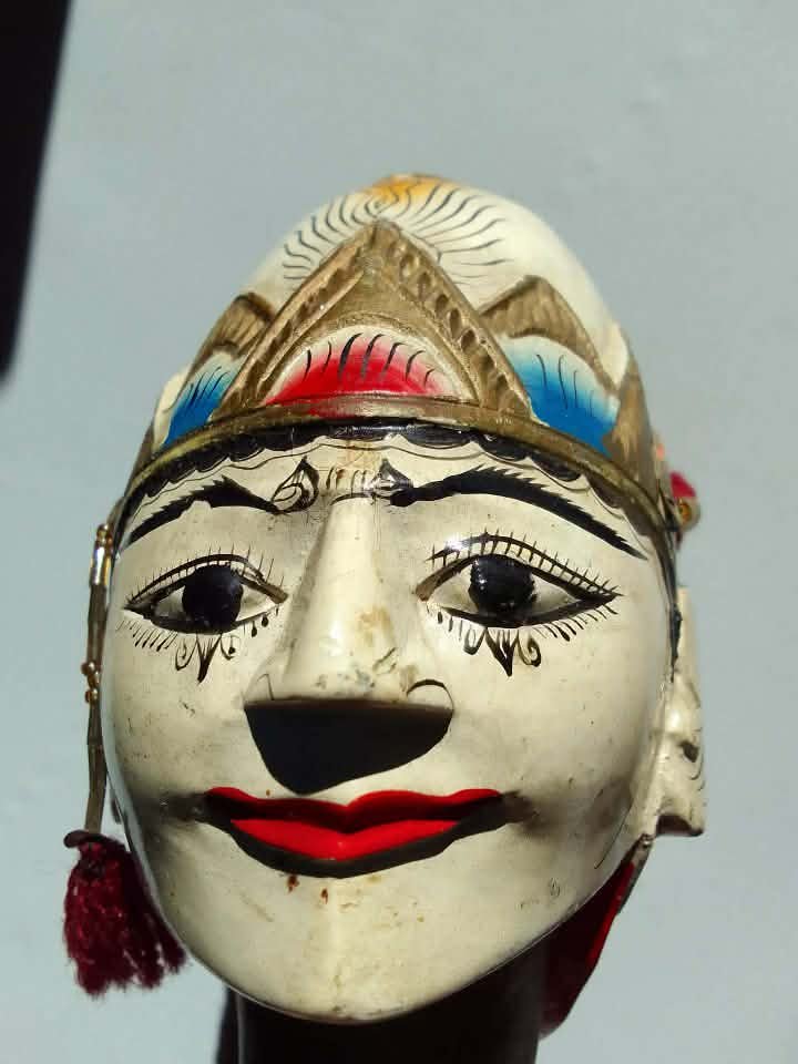 Oryginalna rzeźbiona i ręcznie malowana głowa lalki teatralnej przedstawiająca postać (Shri Kandi) – bohaterkę z indonezyjskiego teatru Wayang, tradycyjnego teatru lalek i masek wywodzącego się z Jawy i Bali. Postać Srikandi jest znaną wojowniczką z eposu Mahabharata, często przedstawianą w sztuce i teatrze indonezyjskim jako symbol odwagi i kobiecej siły.