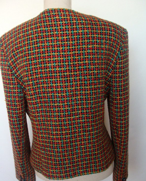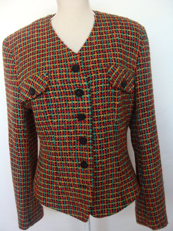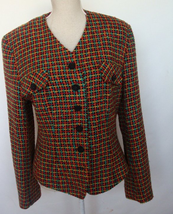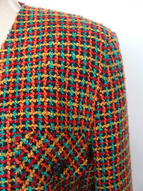 Piękna marynarka z wyraźną fakturą typu drobne boucle , w kolorach czerni, czerwieni , słonecznej żółci i szmaragdu. Bez kołnierza, taliowana, z dwiema patkami imitującymi kieszonki. Zapinana na ozdobne guziki. Całość na podszewce.