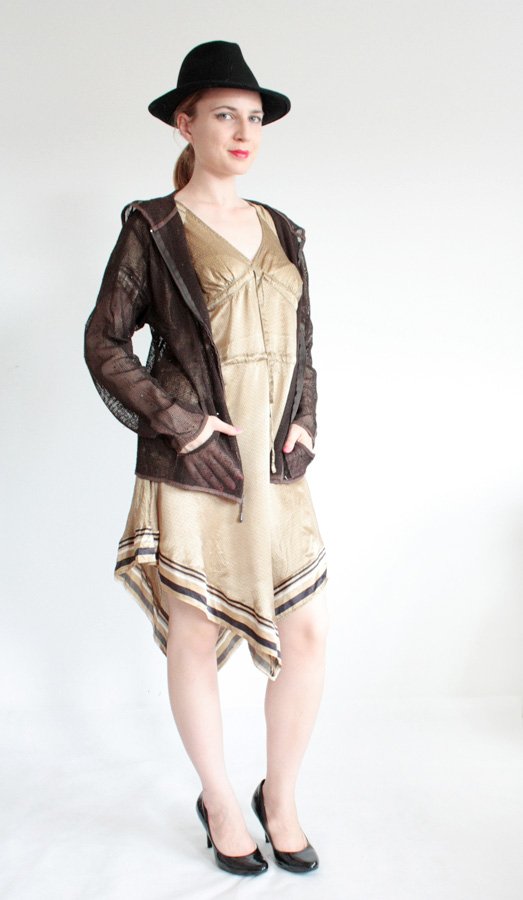 Niezwykle oryginalny, siateczkowy kardigan ozdobiony maleńkimi cekinami w tym samym odcieniu, o niskim połysku.Zapięcie na suwak z ładnym, długim uchwytem. Sweterek idealny do narzucenia na letnią sukienkę.