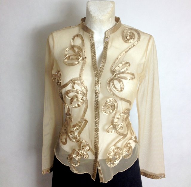 Prześliczny siateczkowy blezer-żakiet marki Per Una w kolorze ciemniejszego beżu wyszywany z przodu na całej długości wyszywany taśmą i zdobiony malutkimi kamyczkami, wzór przechodzi na tył na jedno ramię , zapinany jest na zatrzaski. Fason delikatnie taliowany.