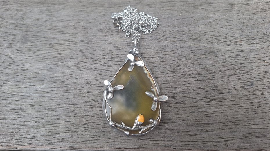 Wisiorek wykonany z miedzi, cyny i agatu. Wymiary ok. 6 na 3.5 cm. Zawieszony na łańcuszku o długości ok. 50 cm.