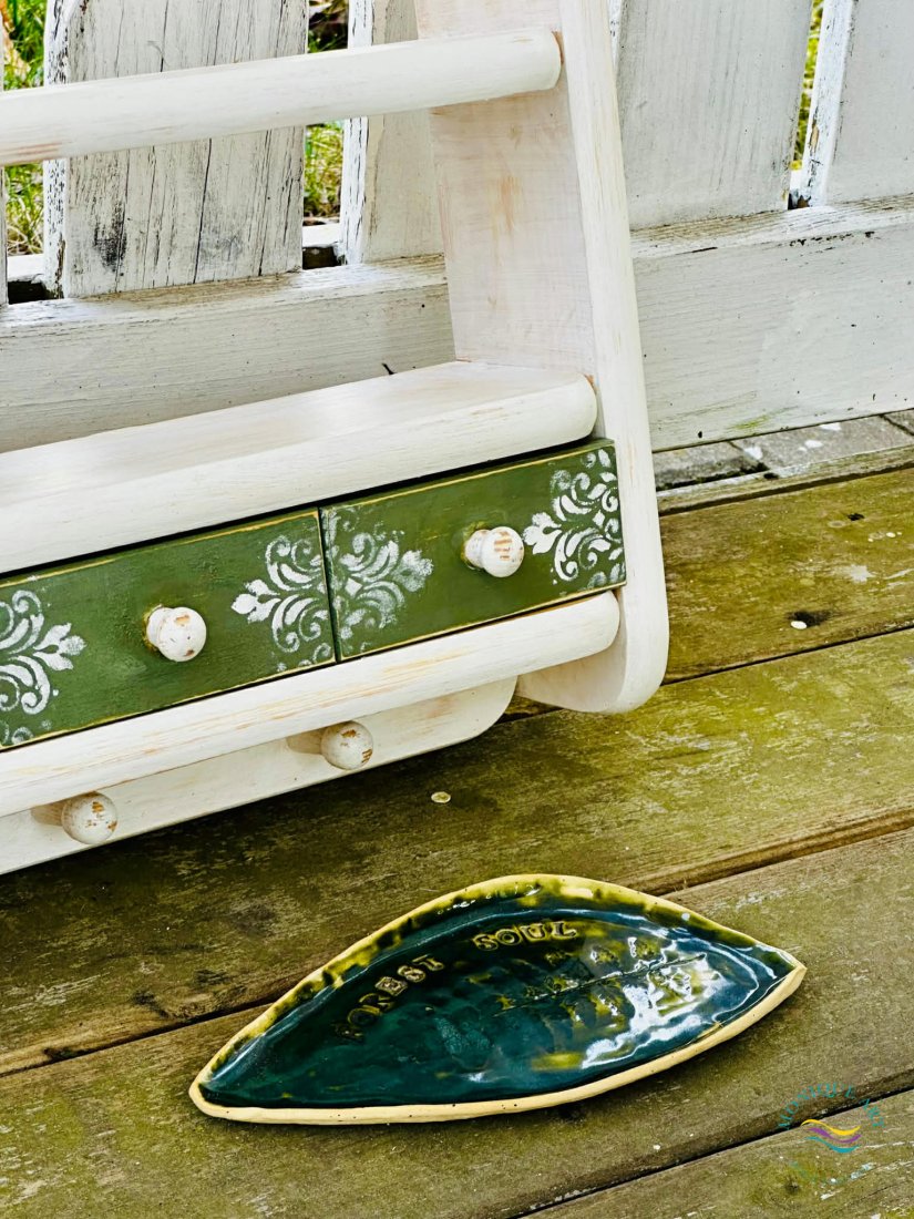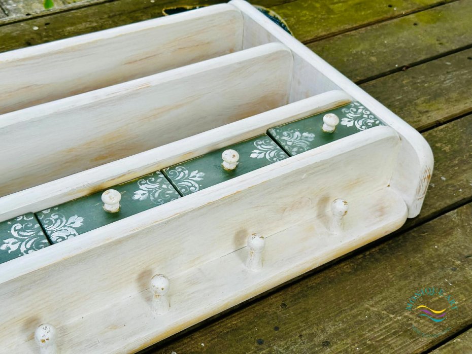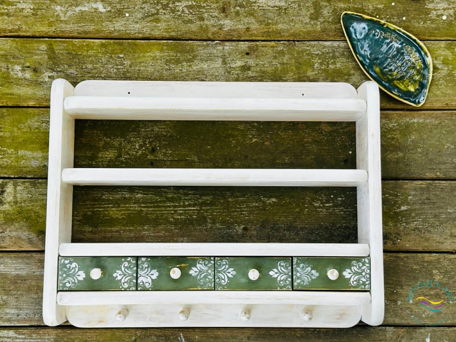 Półka stylizowana dla miłośniczki sielskości we wnętrzach. To połączenie bieli i zieleni. Jeśli szukasz podobnej półki, na której wyeksponujesz to, co jest dla Ciebie ważne, zawiesisz kubki i dzięki temu stworzysz piękny fragment Twojej przestrzeni domowej – zapraszam do kontaktu. Potrzebuję około dwa tygodnie na przygotowanie podobnego mebla.