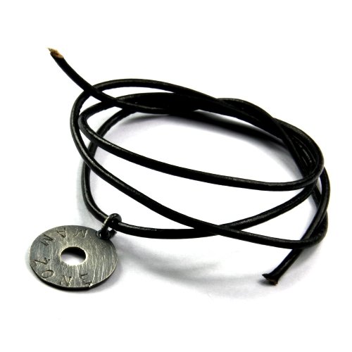 Srebro 925 + rzemień naturalny. Średnica blaszki: 17mm. Na blaszce napis: MAM ŻONĘ. Rzemyk do docięcia i zawiązania: ok. 70cm. Możliwość wybrania innego koloru rzemyka.