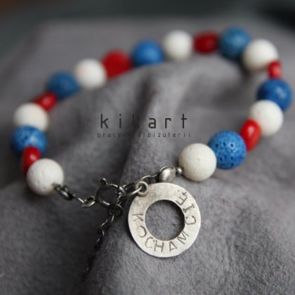 Bransoletka wykonana z kuleczek i plasterków korala (7-8mm) w połączeniu ze srebrną blaszką. Na blaszce napis: KOCHAM CIĘ. Długość bransoletki regulowana: 19-20cm.