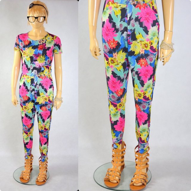 Kolorowy kombinezon w kwiaty o dopasowanym kroju wykonany z troszkę grubszej delikatnie elastycznej tkaniny, góra dopasowana, krok nieznacznie obniżony, nogawki u góry szersze stoponiowo zwężają się ku dołowi, z tyłu zasuwany na suwak, po bokach kieszenie.