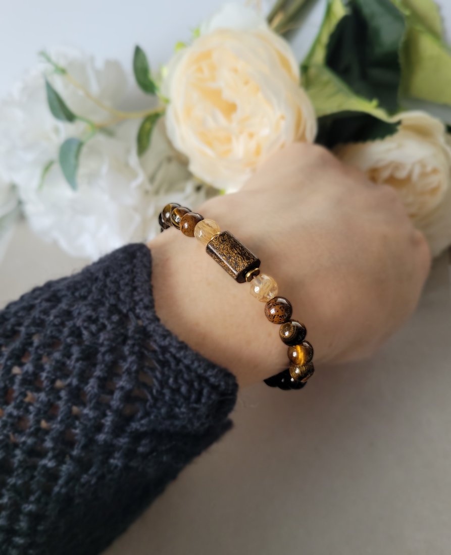 Bransoletka zrobiona z kamieni naturalnych: Tygrysiego oka, Cytrynu, Bronzytu oraz Hematytu w kolorze złota.