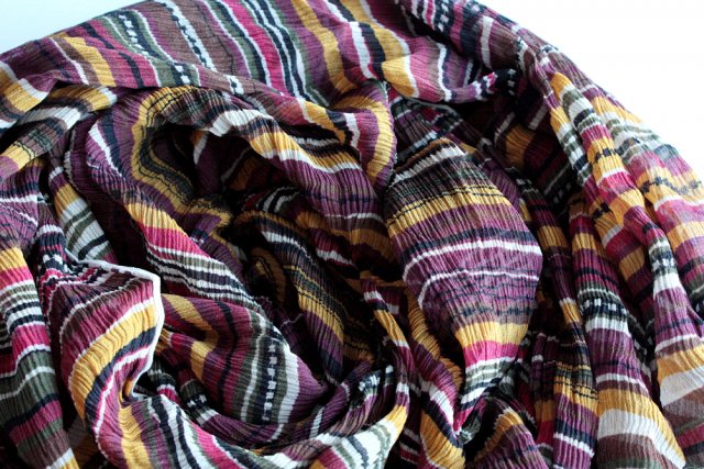 Przedstawiam Państwu szal w przepięknych kolorach w drobne pasy. Tkanina o fakturze mikromarszczeń. Niestety szal nie ma metki, ale moim zdaniem jest to naturalny jedwab (prawdopodobieństwo graniczące z pewnością). Będzie efektownym dodatkiem do stroju w różnym stylu, można dowolnie go stylizować, ponieważ jest naprawdę duży.