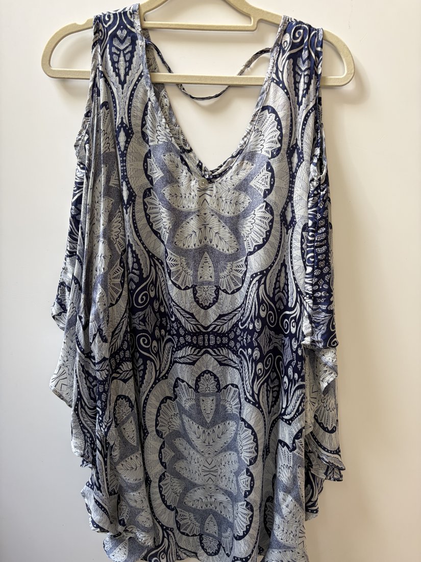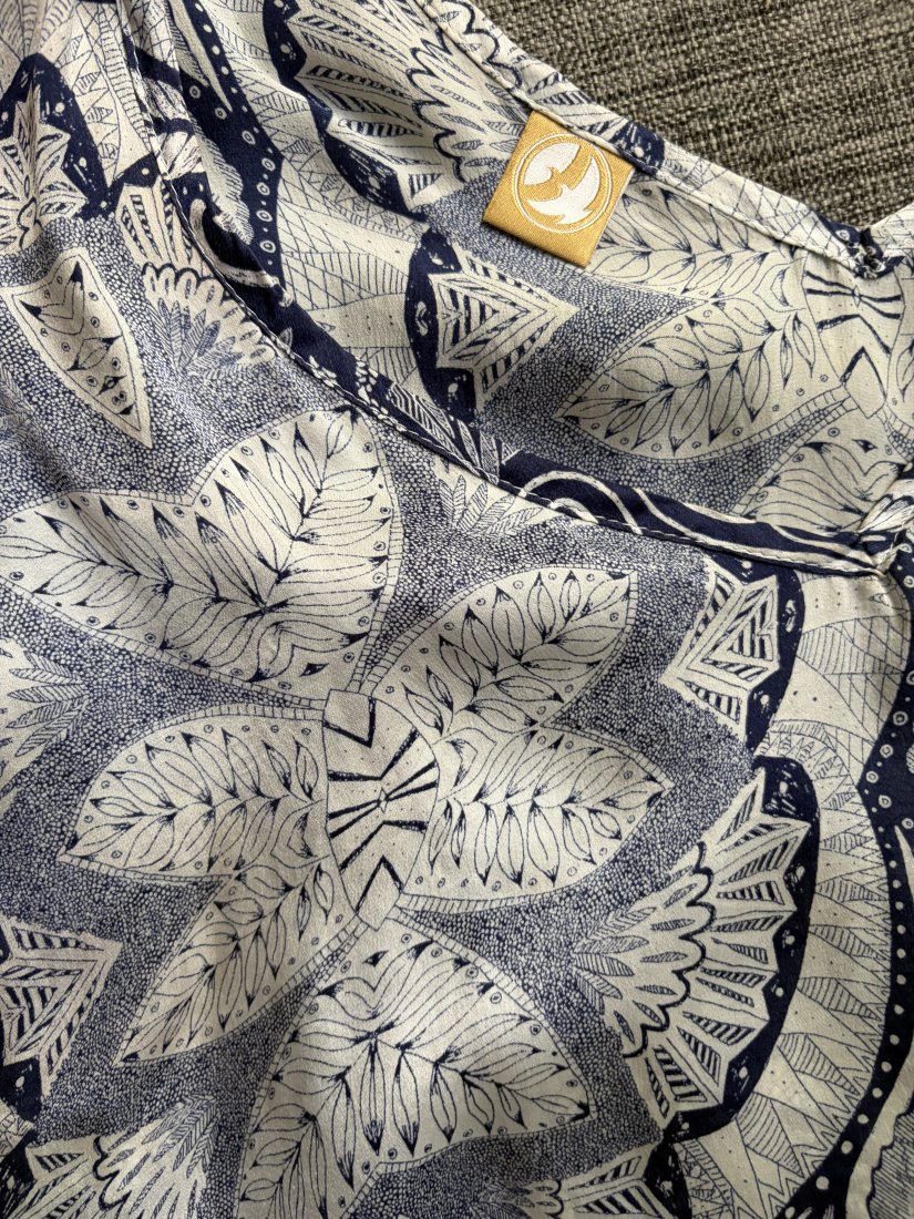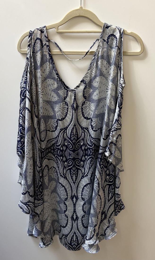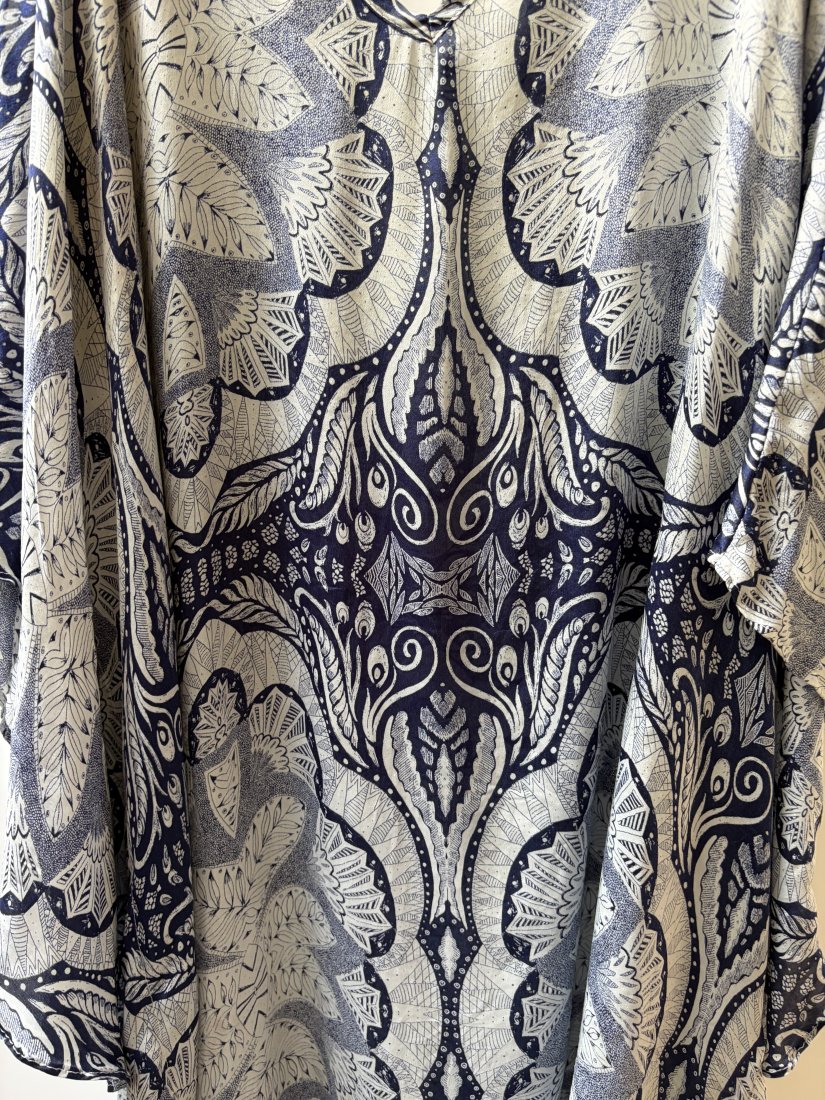 Jedwabna, oryginalna, elegancka bluzka nietoperz . Jest metka firmowa , ale bez nazwy . Brak metki ze składem , ale z całą pewnością jest to jedwab .Jakościowy , o subtelnym satynowym połysku . Idealna na lato . Ciekawy fason . Przód i tył dekolt ( 21 cm szerokości ) w serek , z tyłu zabezpieczony troczkiem , żeby bluzka się nie zsuwała . Na ramionach rozcięcia około 26 cm cm . Długość od dekoltu do " rękawa" około 46 .Nie jest to właściwie typowy rękaw, bo bluzka jest po prostu zszyta po bokach . Szerokość od zszycia do zszycia 68 cm . Długość około 80 boki krótsze . Dół wyoblony . Bardzo ładnie się układa . Stan zachowania bardzo dobry -drobne ślady użytkowania. Wymiary podane mierzone na płasko .