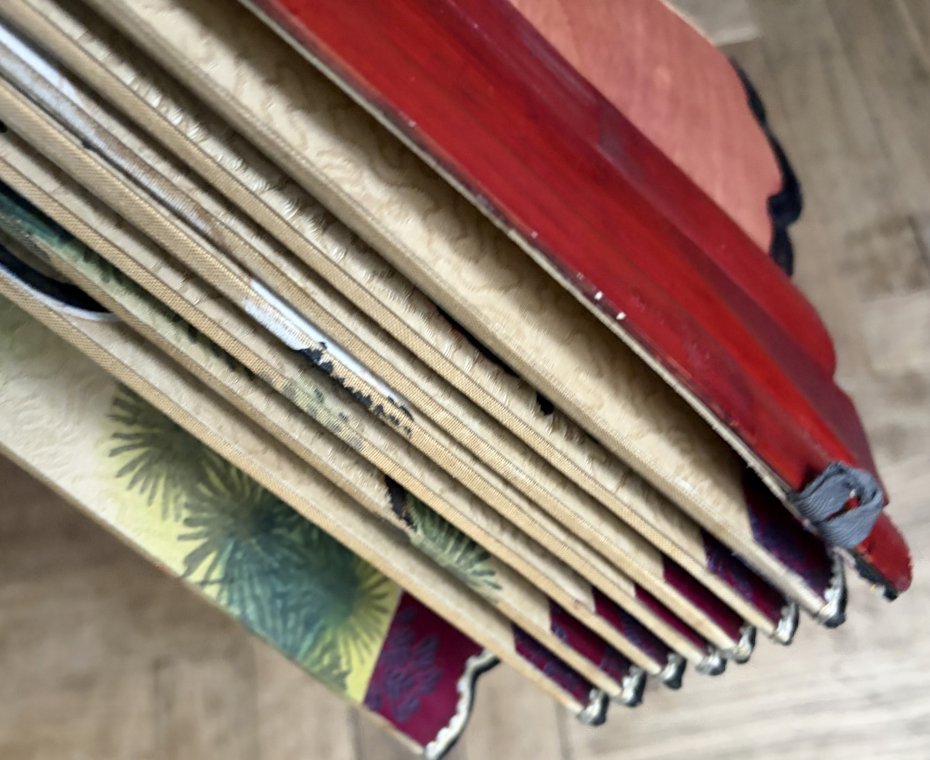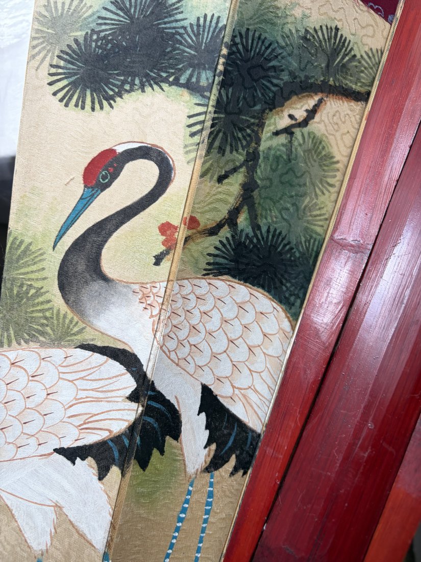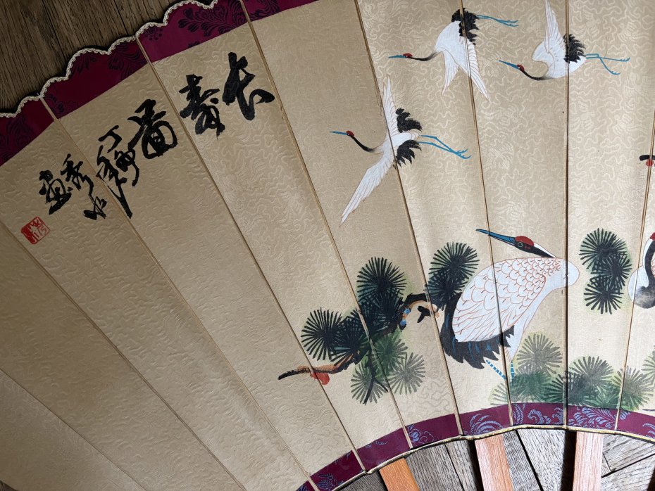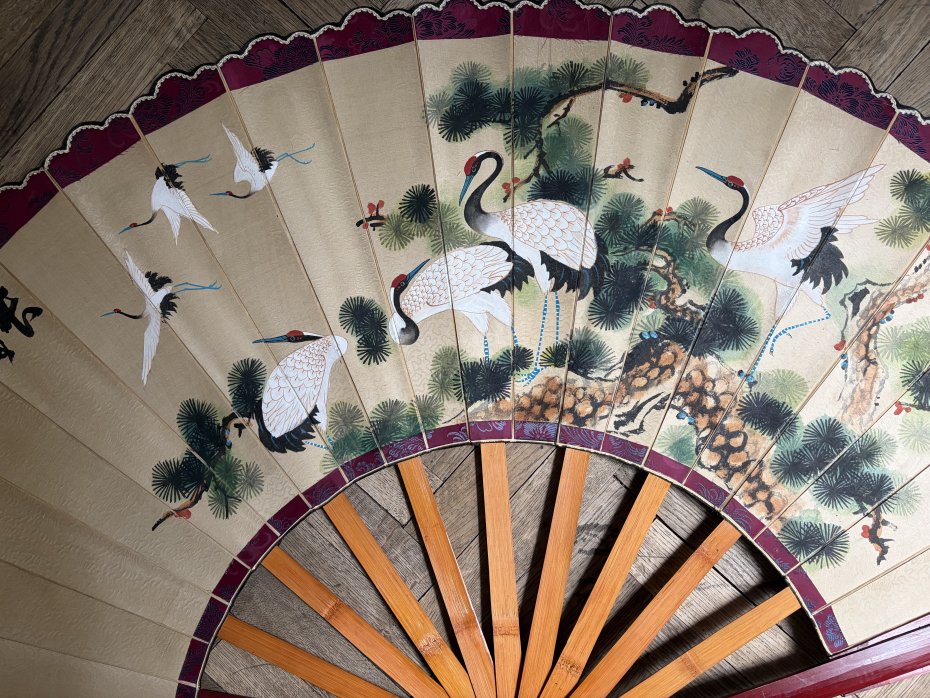 Ręcznie malowany na jedwabiu dawniejszej daty duży ( 145 x 89) wachlarz na ścianę . Po złożeniu 9 x 89 . Precyzyjna kreska , charakterystyczne dla sztuki wschodu motywy , sygnatura . Od spodu podklejone listewki , pętelki do zawieszenia . Rzadko spotykana rzecz na rynku polskim . Fantastyczna, efektowna dekoracja . Stan zachowania bardzo dobry , minimalne ślady użytkowania .