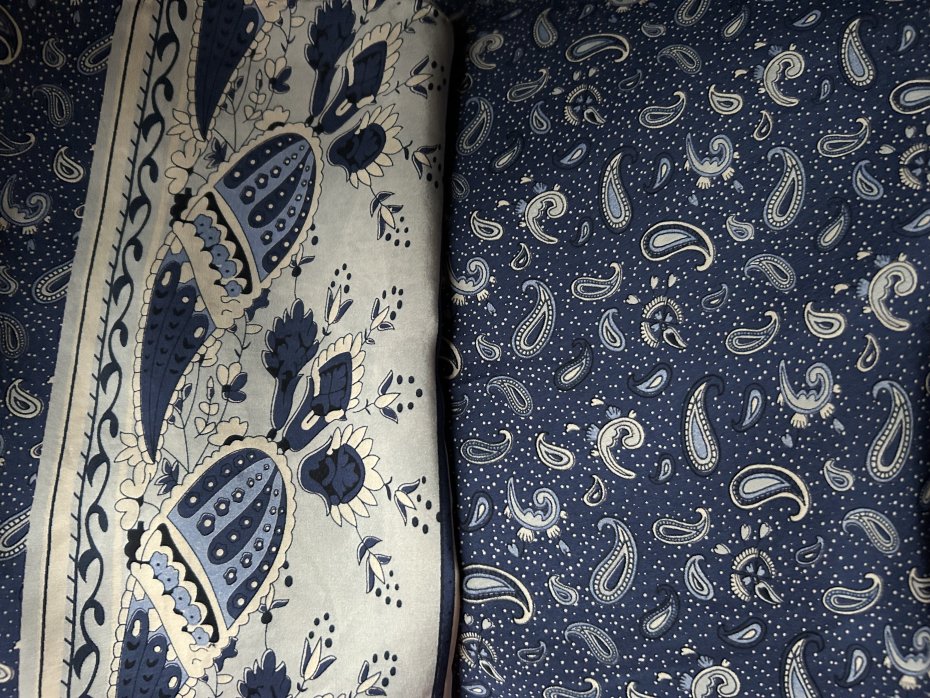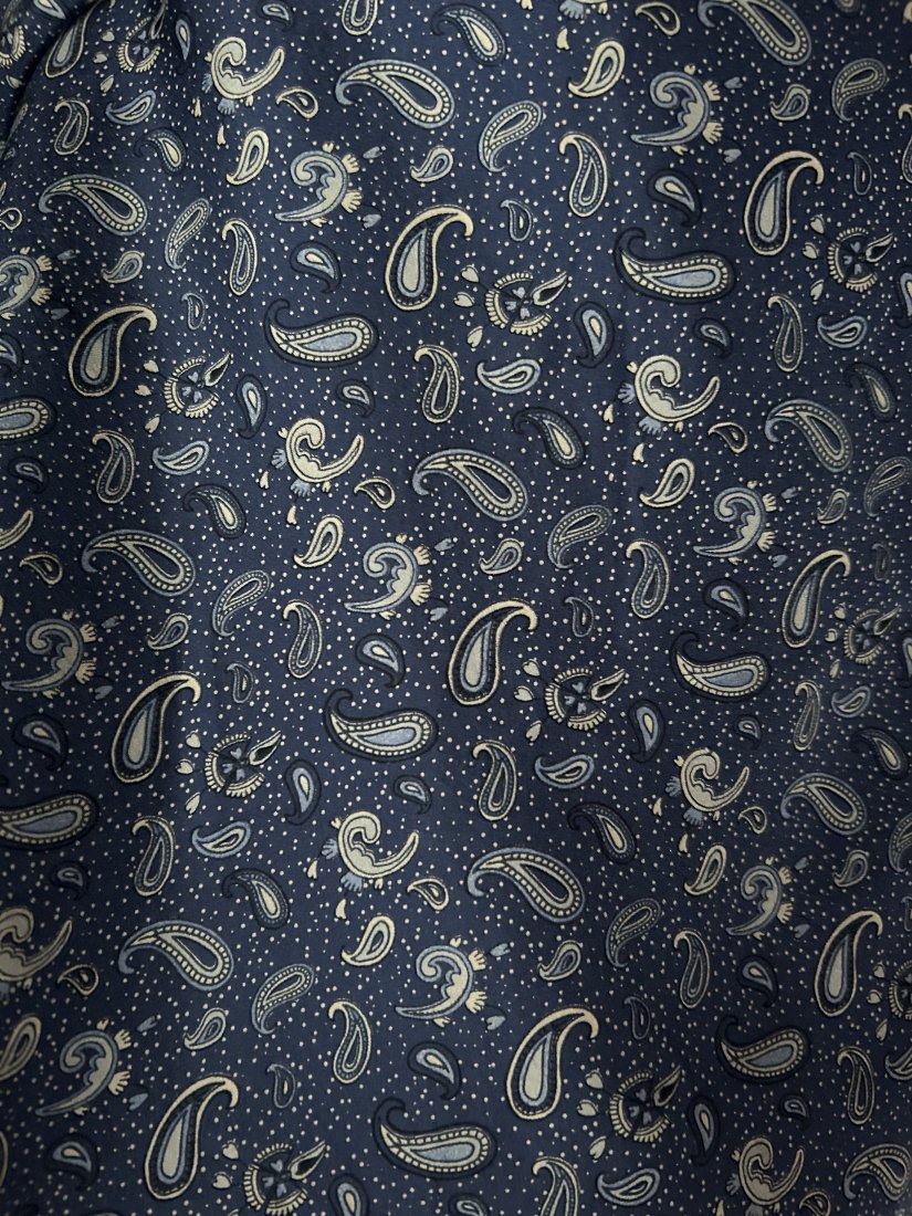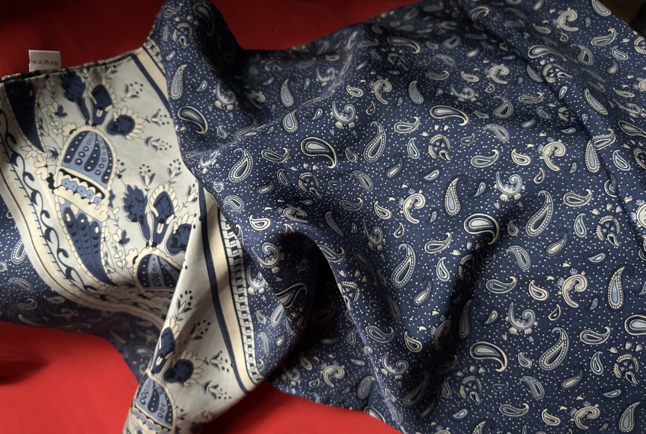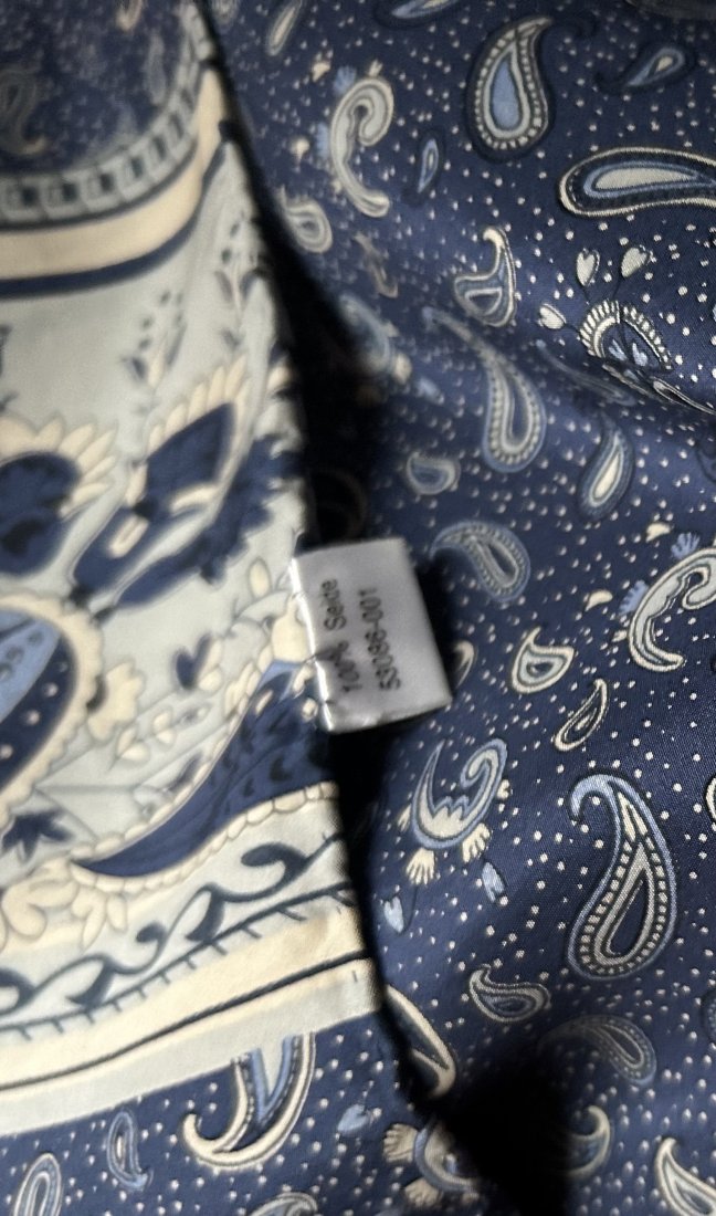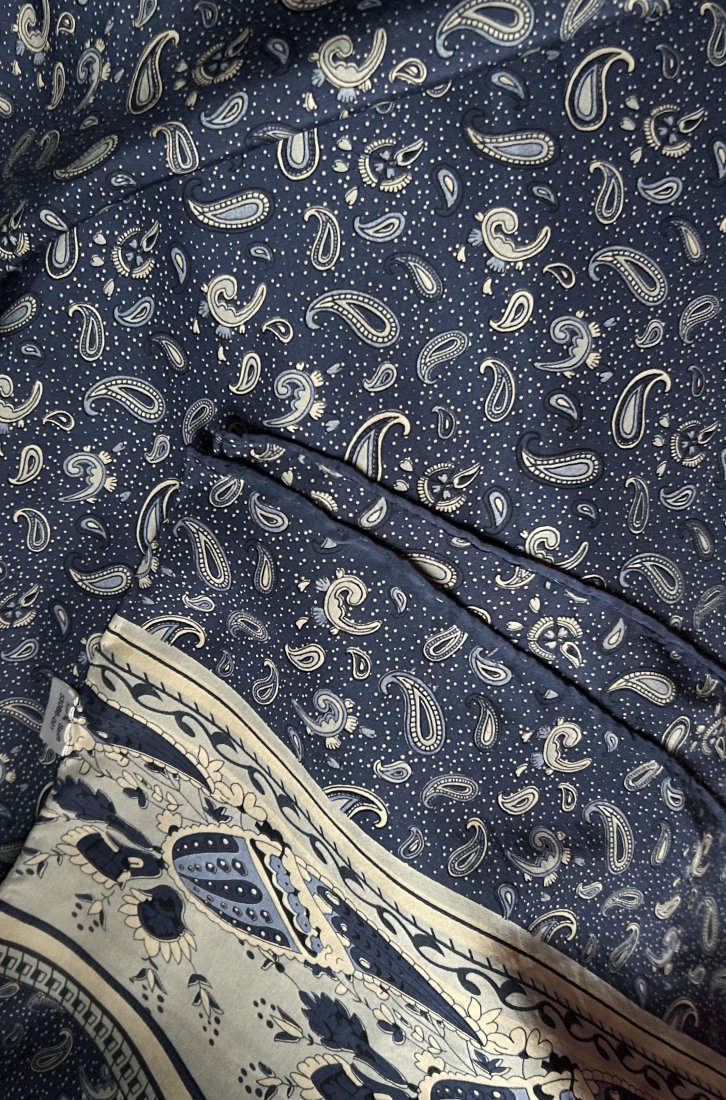 100 % SILK. Elegancki jedwabny szal . Ciekawy wzór , zdobienie z obu stron , niuanse niebieskości i granatów … szczypta jasnego beżu . Wysoka jakość jedwabiu , obrębienie ręczne . 35 x prawie 140 . Stan zachowania bardzo dobry