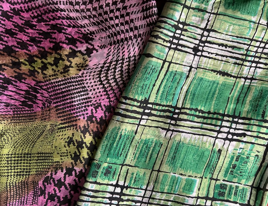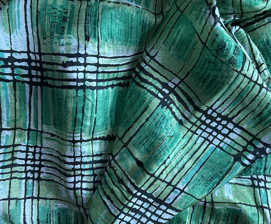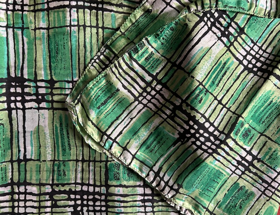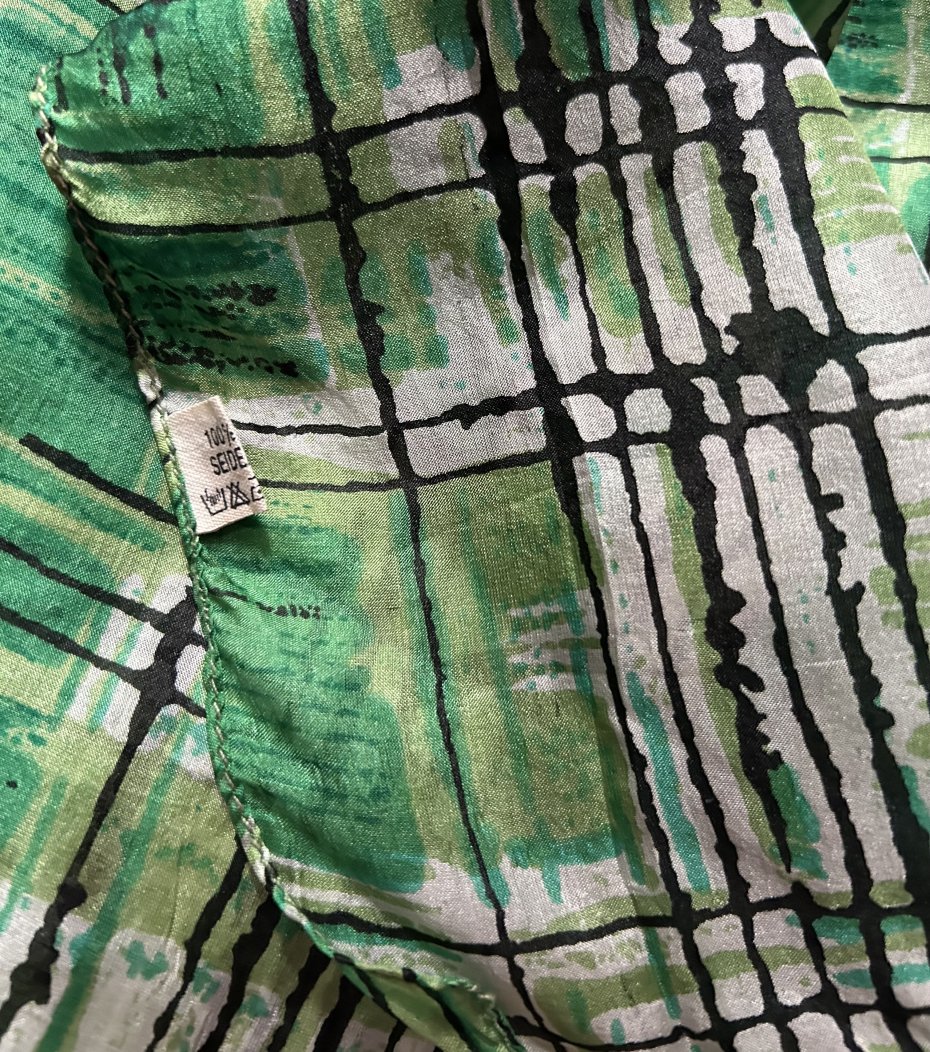Vintage Silk scarf. Jedwabny szal. Graficzne zdobienie , żywe , kontrastowe barwy . Soczysta zieleń zmieniające tonację w zależności od oświetlenia .Ręcznie malowany . Metka 100% SILK. 35 x około 147 . Stan zachowania - drobne ślady użytkowania : dobry . P.S.- na ostatnim zdjęciu razem z innym graficznym , które nosiłam razem .