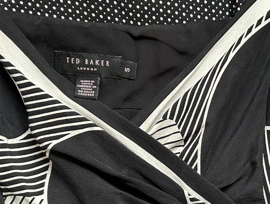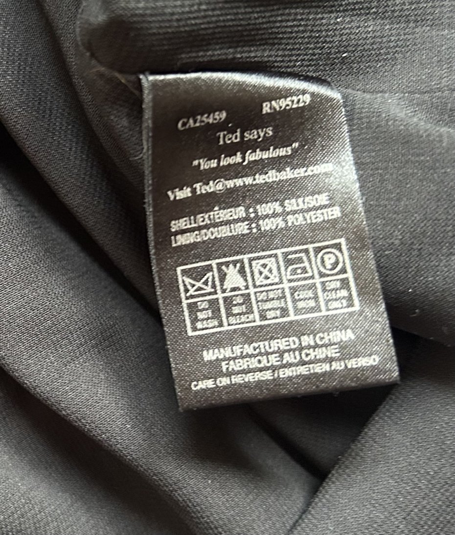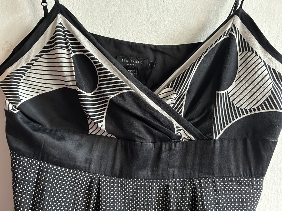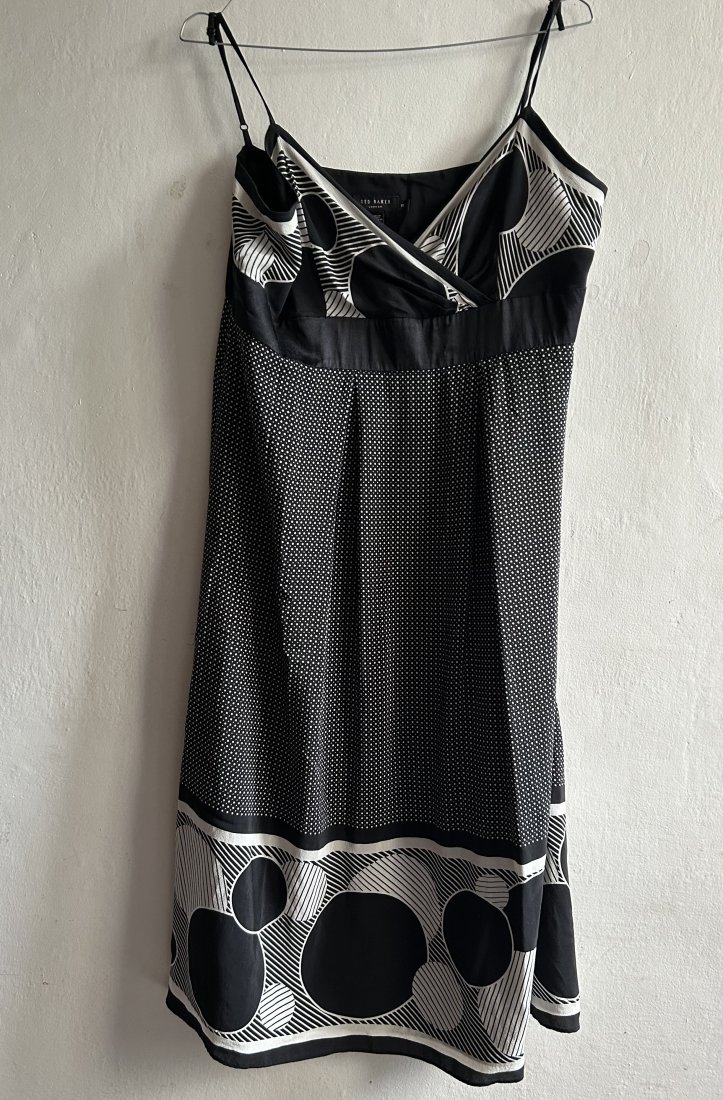 Wizytowa jedwabna sukienka - TED Baker London AN 95229 CA 25459 TED ASUS " You look fabulous". 100% Silk i podszewka z poliestru.Efektowna , elegancka . Regulowane ,satynowe, cienkie ramiączka , suwak z boku. Odcięcie pod biustem ( wstawka z satynowego czarnego jedwabiu. Pachy 50 cm pod biustem 43 szerokość odcięcia 5 cm długość od odcięcia 77 cm długość do ramiączek 100 cm szerokość na dole 75 cm Wymiary podane mierzone na płasko . Stsn zachowania bardzo dobry . Metki : firmowa i ze składem obecne . Proszę sprawdzić wymiary w opisie .